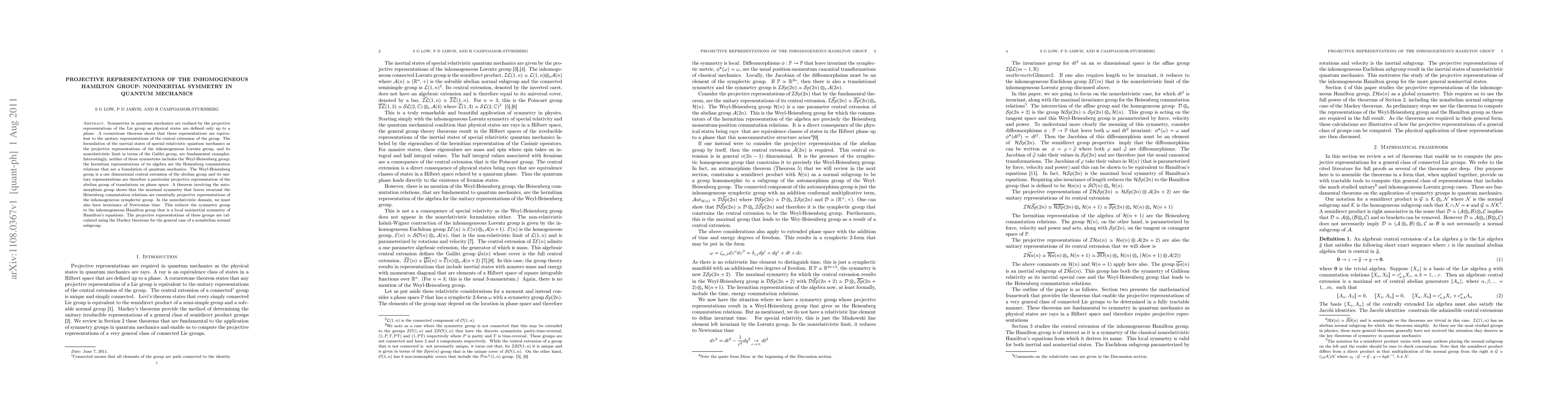 Symmetries in quantum mechanics are realized by the projective representations of the Lie group as physical states are defined only up to a phase. A cornerstone theorem shows that these representations are equivalent to the unitary representations of the central extension of the group. The formulation of the inertial states of special relativistic quantum mechanics as the projective representations of the inhomogeneous Lorentz group, and its nonrelativistic limit in terms of the Galilei group, are fundamental examples. Interestingly, neither of these symmetries includes the Weyl-Heisenberg group; the hermitian representations of its algebra are the Heisenberg commutation relations that are a foundation of quantum mechanics. The Weyl-Heisenberg group is a one dimensional central extension of the abelian group and its unitary representations are therefore a particular projective representation of the abelian group of translations on phase space. A theorem involving the automorphism group shows that the maximal symmetry that leaves invariant the Heisenberg commutation relations are essentially projective representations of the inhomogeneous symplectic group. In the nonrelativistic domain, we must also have invariance of Newtonian time. This reduces the symmetry group to the inhomogeneous Hamilton group that is a local noninertial symmetry of Hamilton's equations. The projective representations of these groups are calculated using the Mackey theorems for the general case of a nonabelian normal subgroup.