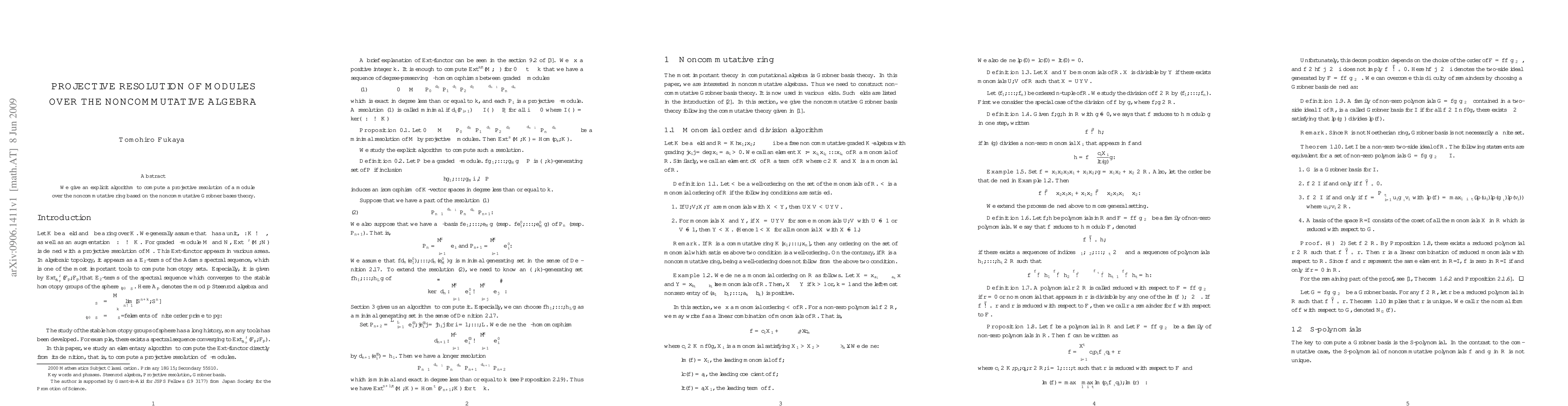 Summary: This paper presents an explicit algorithm for computing projective resolutions of modules over noncommutative rings, utilizing noncommutative Groebner bases theory for its methodology. The approach provides a systematic way to understand module structures in noncommutative algebra.