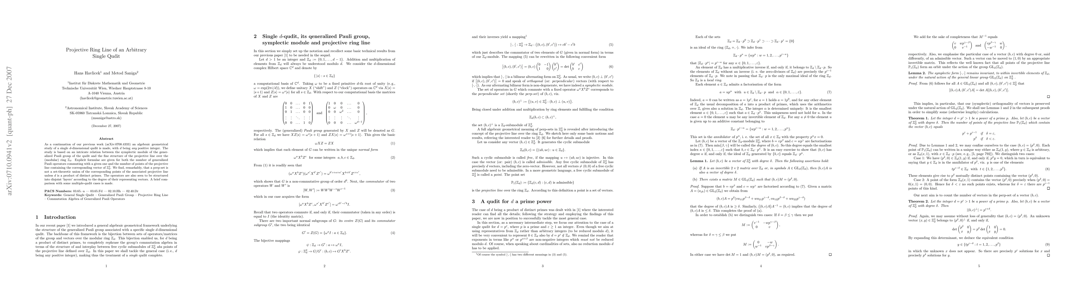 This paper extends previous work to study the algebraic geometry of a single $d$-dimensional qudit, revealing a connection between the symplectic module of the generalized Pauli group and the projective line over the ring $\bZ_{d}$. It finds that a perp-set is not a union of points on the projective line unless $d$ is a product of distinct primes, and identifies disjoint layers of operators based on the degree of their representing vectors.