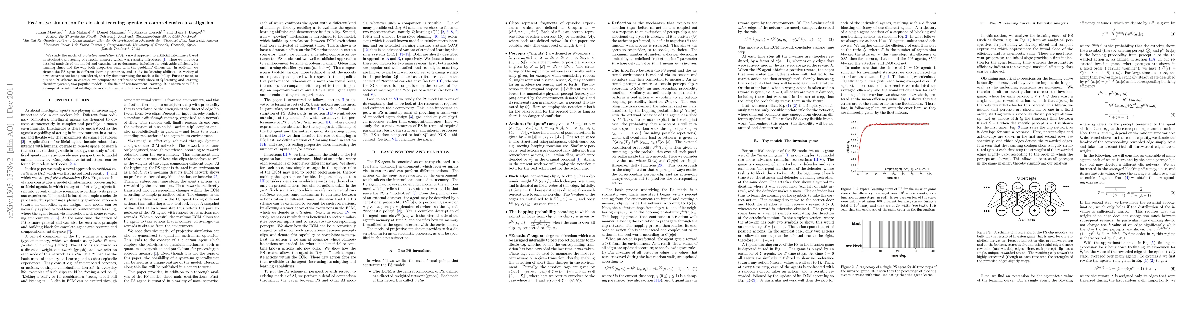 We study the model of projective simulation (PS), a novel approach to artificial intelligence based on stochastic processing of episodic memory which was recently introduced [H.J. Briegel and G. De las Cuevas. Sci. Rep. 2, 400, (2012)]. Here we provide a detailed analysis of the model and examine its performance, including its achievable efficiency, its learning times and the way both properties scale with the problems' dimension. In addition, we situate the PS agent in different learning scenarios, and study its learning abilities. A variety of new scenarios are being considered, thereby demonstrating the model's flexibility. Furthermore, to put the PS scheme in context, we compare its performance with those of Q-learning and learning classifier systems, two popular models in the field of reinforcement learning. It is shown that PS is a competitive artificial intelligence model of unique properties and strengths.