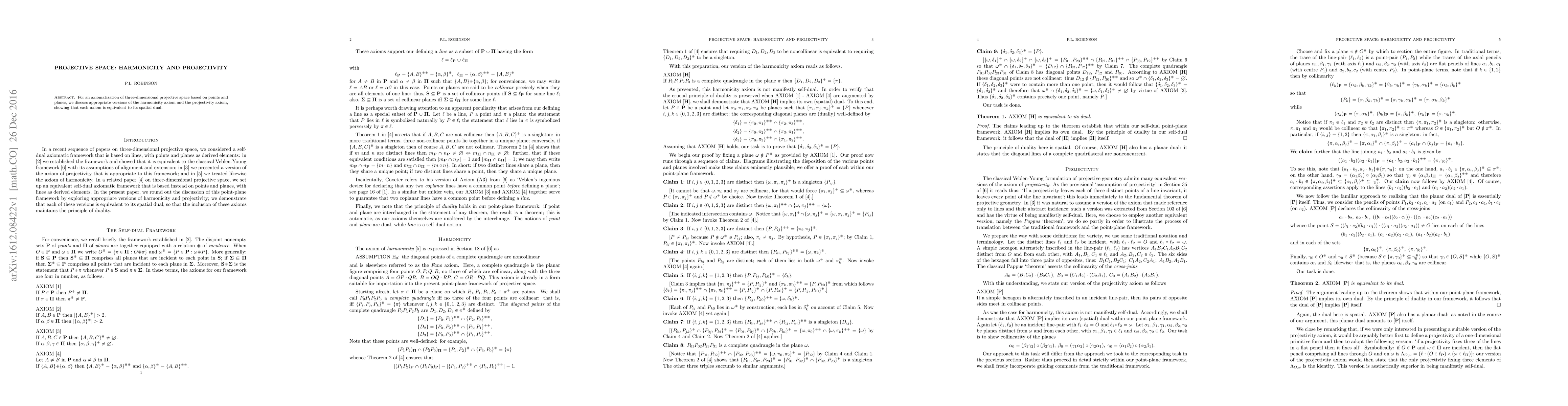 This paper explores the harmonicity axiom and projectivity axiom for a three-dimensional projective space based on points and planes, showing they are equivalent to their spatial duals.