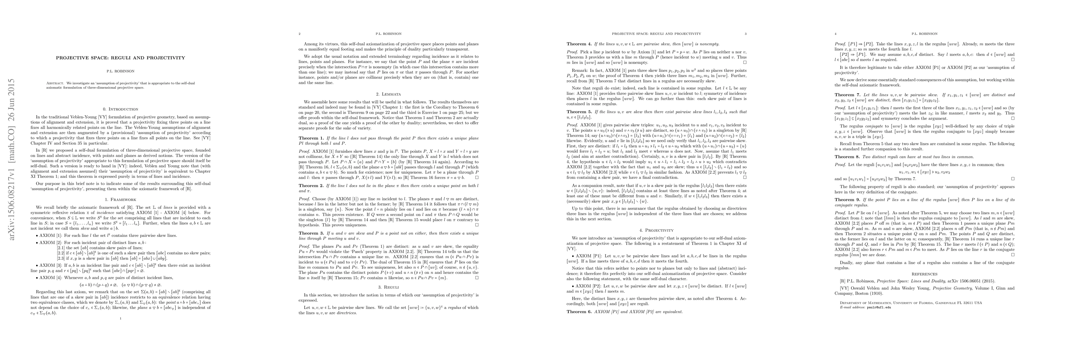 Summary: This paper explores the concept of "projectivity" within the self-dual axiomatic framework of three-dimensional projective space, aiming to understand its implications and properties. The focus is on the mathematical structure and assumptions underlying reguli in projective space.