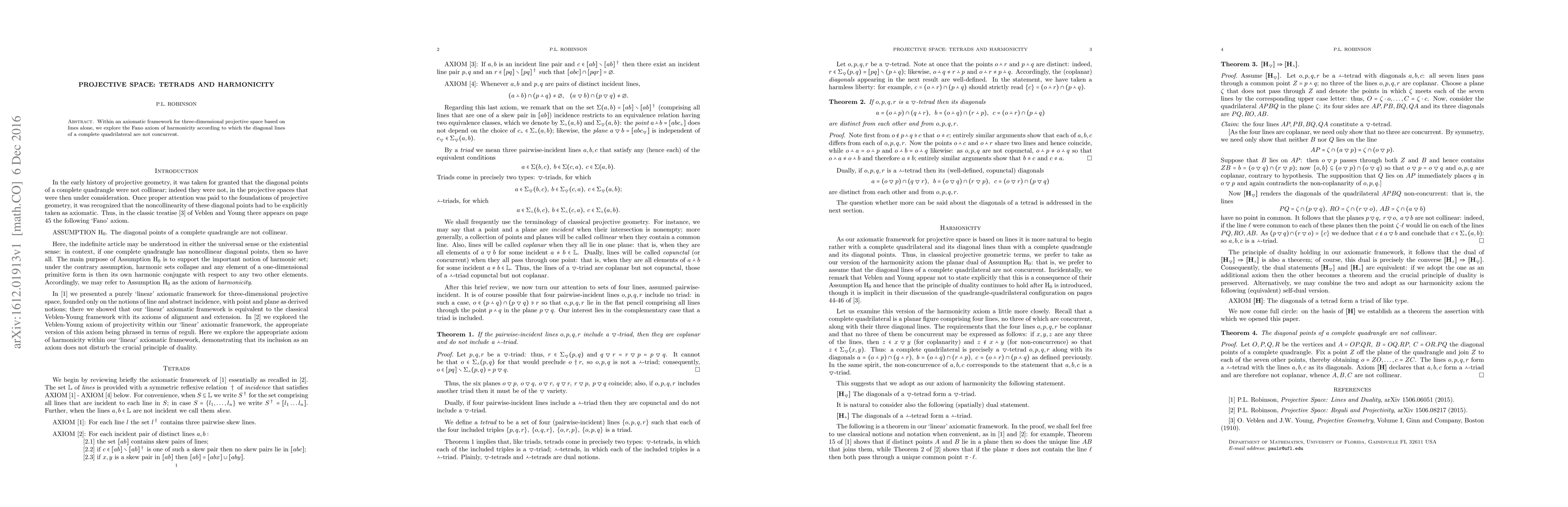 Within an axiomatic framework for three-dimensional projective space based on lines alone, we explore the Fano axiom of harmonicity according to which the diagonal lines of a complete quadrilateral are not concurrent.