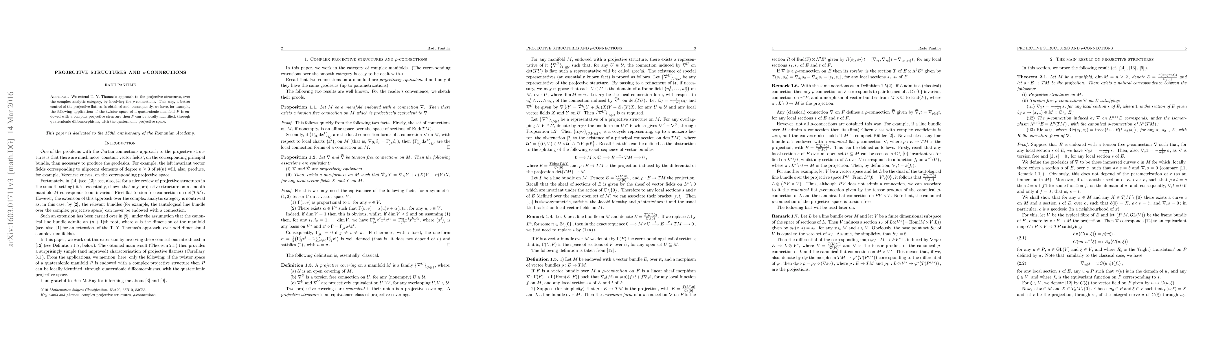 We extend T. Y. Thomas's approach to the projective structures, over the complex analytic category, by involving the $\rho$-connections. This way, a better control of the projective flatness is obtained and, consequently, we have, for example, the following application: if the twistor space of a quaternionic manifold $P$ is endowed with a complex projective structure then $P$ can be locally identified, through quaternionic diffeomorphisms, with the quaternionic projective space.