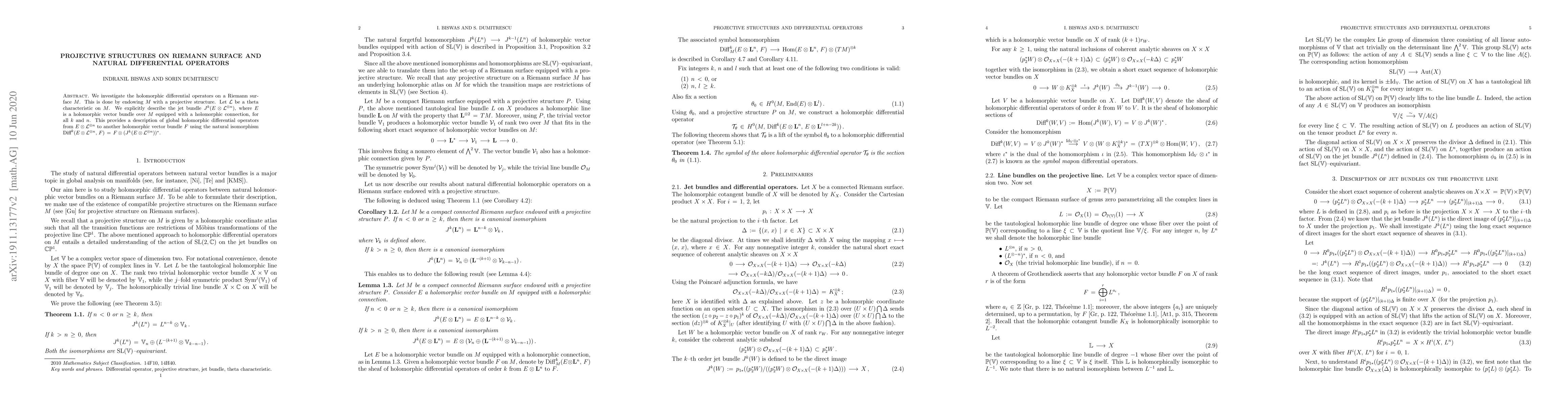 We investigate the holomorphic differential operators on a Riemann surface $M$. This is done by endowing $M$ with a projective structure. Let $\mathcal L$ be a theta characteristic on $M$. We explicitly describe the jet bundle $J^k(E\otimes {\mathcal L}^{\otimes n})$, where $E$ is a holomorphic vector bundle on $M$ equipped with a holomorphic connection, for all $k$ and $n$. This provides a description of holomorphic differential operators from $E\otimes {\mathcal L}^{\otimes n}$ to another holomorphic vector bundle $F$ using the natural isomorphism $\text{Diff}^k(E\otimes {\mathcal L}^{\otimes n}, F)= F\otimes (J^k(E\otimes {\mathcal L}^{\otimes n}))^*$.