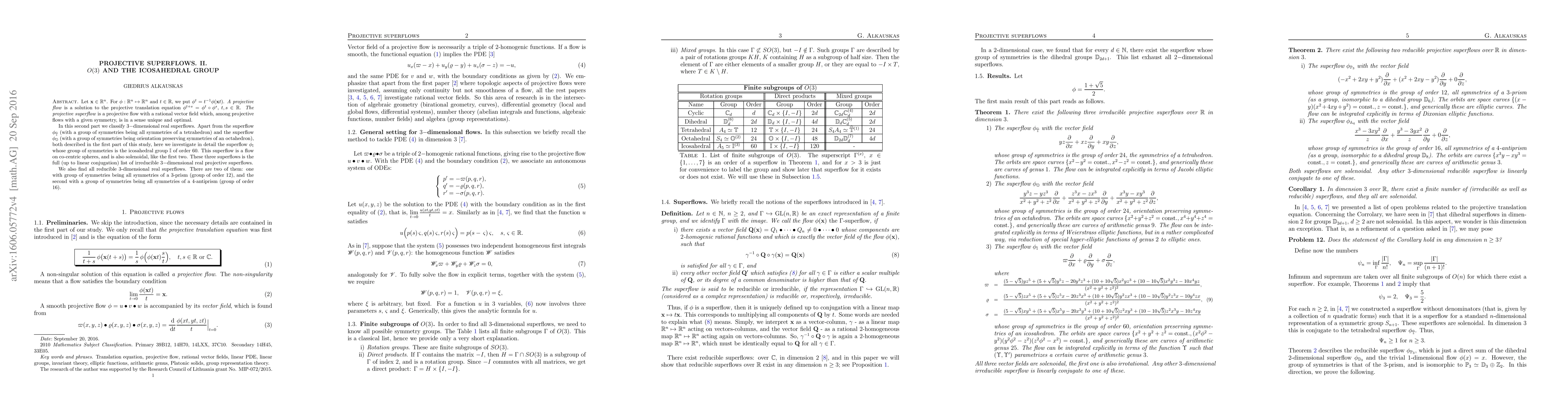 Let $X\in\mathbb{R}^{n}$. For $\phi:\mathbb{R}^{n}\mapsto\mathbb{R}^{n}$ and $t\in\mathbb{R}$, we put $\phi^{t}=t^{-1}\phi(Xt)$. A projective flow is a solution to the projective translation equation $\phi^{t+s}=\phi^{t}\circ\phi^{s}$, $t,s\in\mathbb{R}$. The projective superflow is a projective flow with a rational vector field which, among projective flows with a given symmetry, is in a sense unique and optimal. In this second part we classify $3$-dimensional real superflows. Apart from the superflow $\phi_{\hat{\mathbb{T}}}$ (with a group of symmetries being all symmetries of a tetrahedron) and the superflow $\phi_{\mathbb{O}}$ (with a group of symmetries being orientation preserving symmetries of an octahedron), both described in the first part of this study, here we investigate in detail the superflow $\phi_{\mathbb{I}}$ whose group of symmetries is the icosahedral group $\mathbb{I}$ of order $60$. This superflow is a flow on co-centric spheres, and is also solenoidal. These three superflows is the full (up to linear conjugation) list of $3$-dimensional irreducible real projective superflows. We also find all reducible $3$-dimensional real superflows. There are two of them: one with group of symmetries being all symmetries of a $3$-prism (group of order $12$), and the second with a group of symmetries being all symmetries of a $4$-antiprism (group of order $16$).