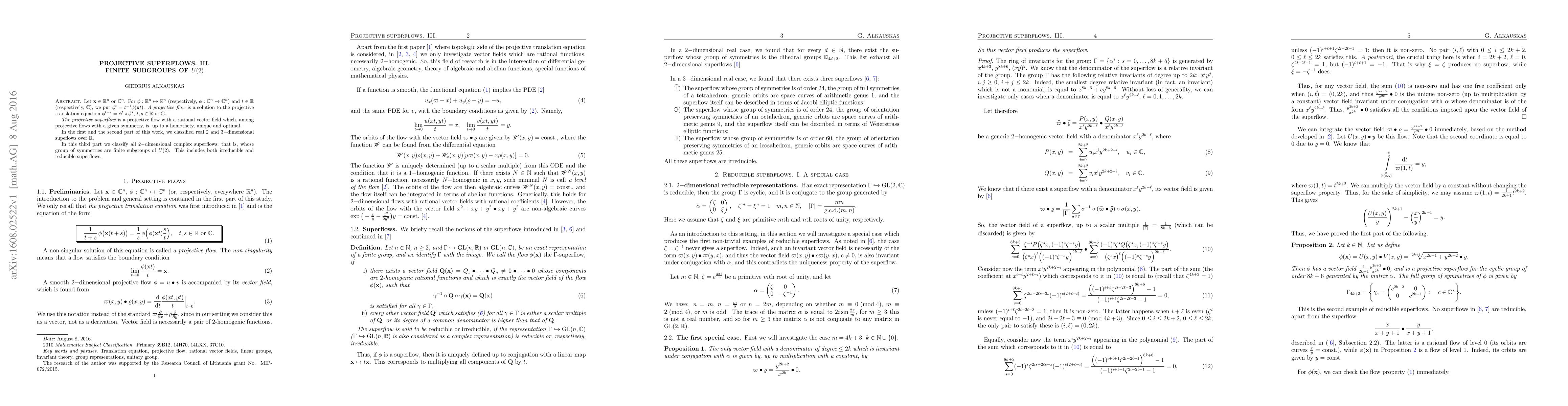 Let $X\in\mathbb{R}^{n}$ or $\mathbb{C}^{n}$. For $\phi:\mathbb{R}^{n}\mapsto\mathbb{R}^{n}$ (respectively, $\phi:\mathbb{C}^{n}\mapsto\mathbb{C}^{n}$) and $t\in\mathbb{R}$ (respectively, $\mathbb{C}$), we put $\phi^{t}=t^{-1}\phi(Xt)$. A projective flow is a solution to the projective translation equation $\phi^{t+s}=\phi^{t}\circ\phi^{s}$, $t,s\in\mathbb{R}$ or $\mathbb{C}$. The projective superflow is a projective flow with a rational vector field which, among projective flows with a given symmetry, is, up to a homothety, unique and optimal. In the first and the second part of this work we classified real $2$ and $3-$dimensional supeflows over $\mathbb{R}$. In this third part we classify all $2-$dimensional complex superflows; that is, whose group of symmetries are finite subgroups of $U(2)$. This includes both irreducible and reducible superflows.