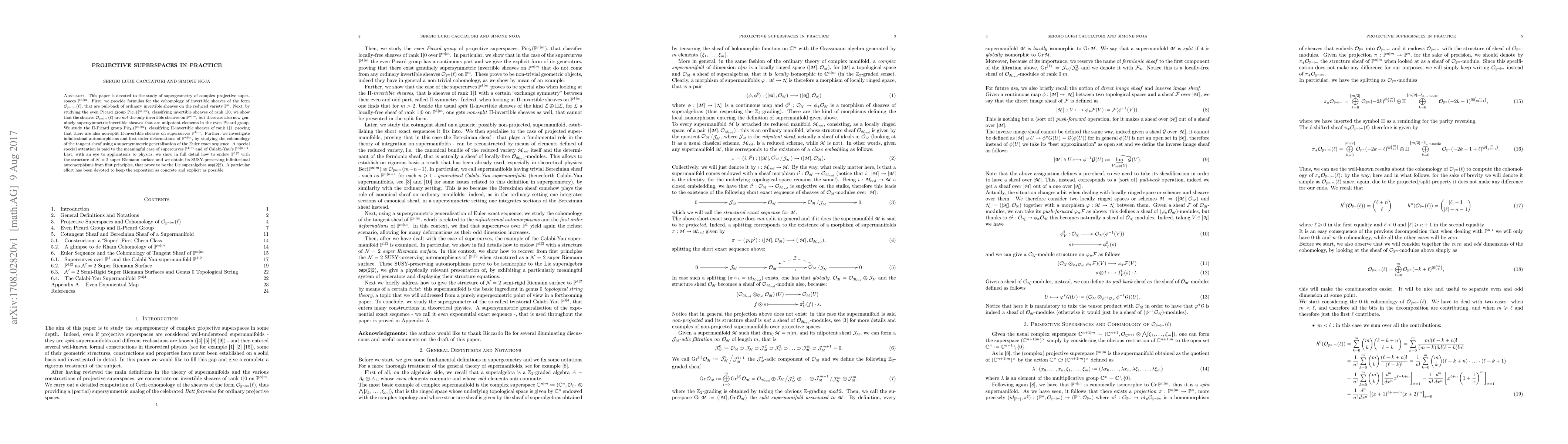 We study the supergeometry of complex projective superspaces $\mathbb{P}^{n|m}$. First, we provide formulas for the cohomology of invertible sheaves of the form $\mathcal{O}_{\mathbb{P}^{n|m}} (\ell)$, that are pull-back of ordinary invertible sheaves on the reduced variety $\mathbb{P}^n$. Next, by studying the even Picard group $\mbox{Pic}_0 (\mathbb{P}^{n|m})$, classifying invertible sheaves of rank $1|0$, we show that the sheaves $\mathcal{O}_{\mathbb {P}^{n|m}} (\ell)$ are not the only invertible sheaves on $\mathbb{P}^{n|m}$, but there are also new genuinely supersymmetric invertible sheaves that are unipotent elements in the even Picard group. We study the $\Pi$-Picard group $\mbox{Pic}_\Pi (\mathbb{P}^{n|m})$, classifying $\Pi$-invertible sheaves of rank $1|1$, proving that there are also non-split $\Pi$-invertible sheaves on supercurves $\mathbb{P}^{1|m}$. Further, we investigate infinitesimal automorphisms and first order deformations of $\mathbb{P}^{n|m}$, by studying the cohomology of the tangent sheaf using a supersymmetric generalisation of the Euler exact sequence. A special special attention is paid to the meaningful case of supercurves $\mathbb{P}^{1|m}$ and of Calabi-Yau's $\mathbb{P}^{n|n+1}$. Last, with an eye to applications to physics, we show in full detail how to endow $\mathbb{P}^{1|2}$ with the structure of $\mathcal{N}=2$ super Riemann surface and we obtain its SUSY-preserving infinitesimal automorphisms from first principles, that prove to be the Lie superalgebra $\mathfrak{osp} (2|2)$. A particular effort has been devoted to keep the exposition as concrete and explicit as possible.