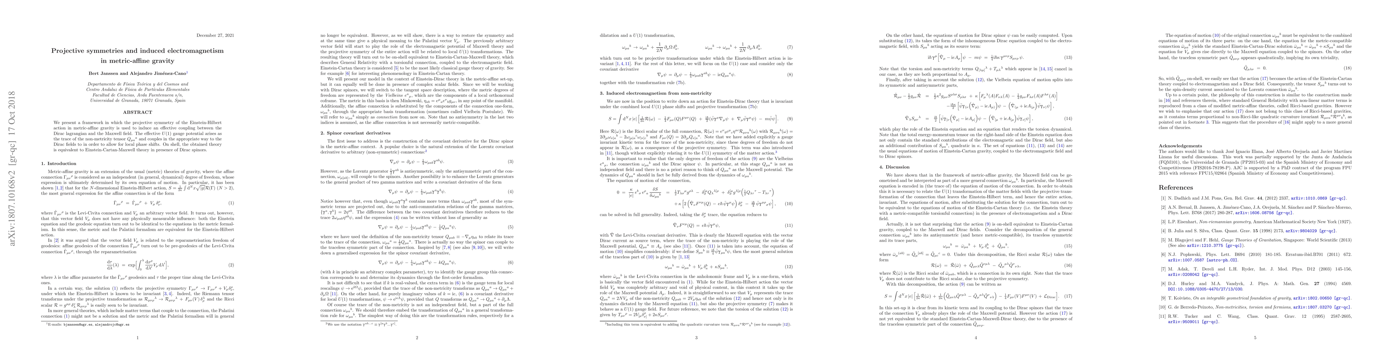 A new framework in metric-affine gravity introduces a projective symmetry that induces an effective coupling between Dirac fields and Maxwell fields, resulting in an equivalent Einstein-Cartan-Maxwell theory with Dirac spinors.