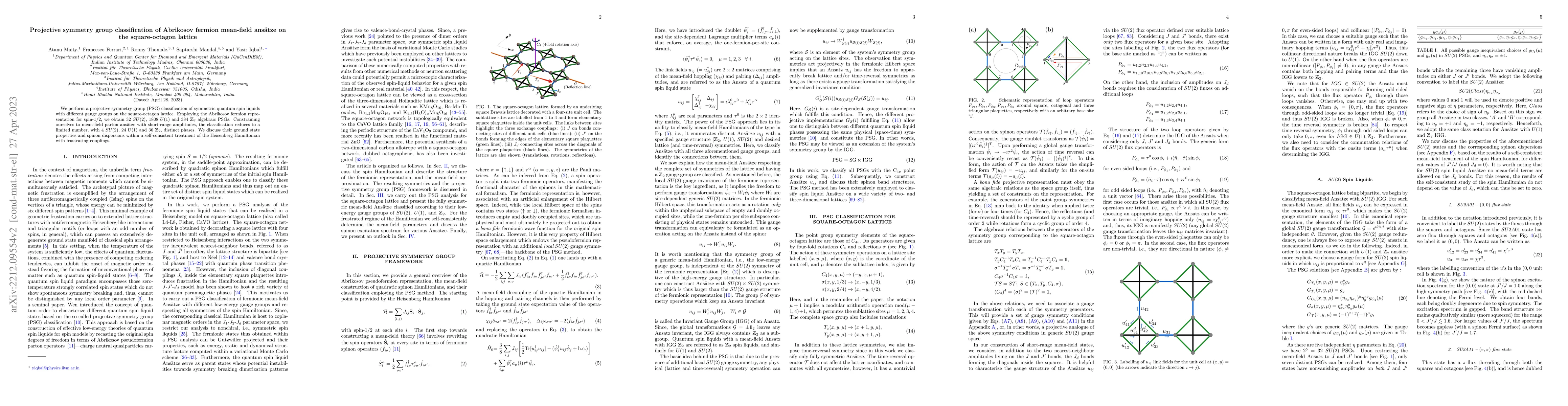 This paper classifies projective symmetry group (PSG) structures for quantum spin liquids on the square-octagon lattice using Abrikosov fermion mean-field ansätze. It identifies 32 $SU(2)$, 1808 $U(1)$, and 384 $\mathbb{Z}_{2}$ PSGs, reducing to 4 $SU(2)$, 24 $U(1)$, and 36 $\mathbb{Z}_{2}$ distinct phases under mean-field constraints, and discusses their ground state properties and spinon dispersions.