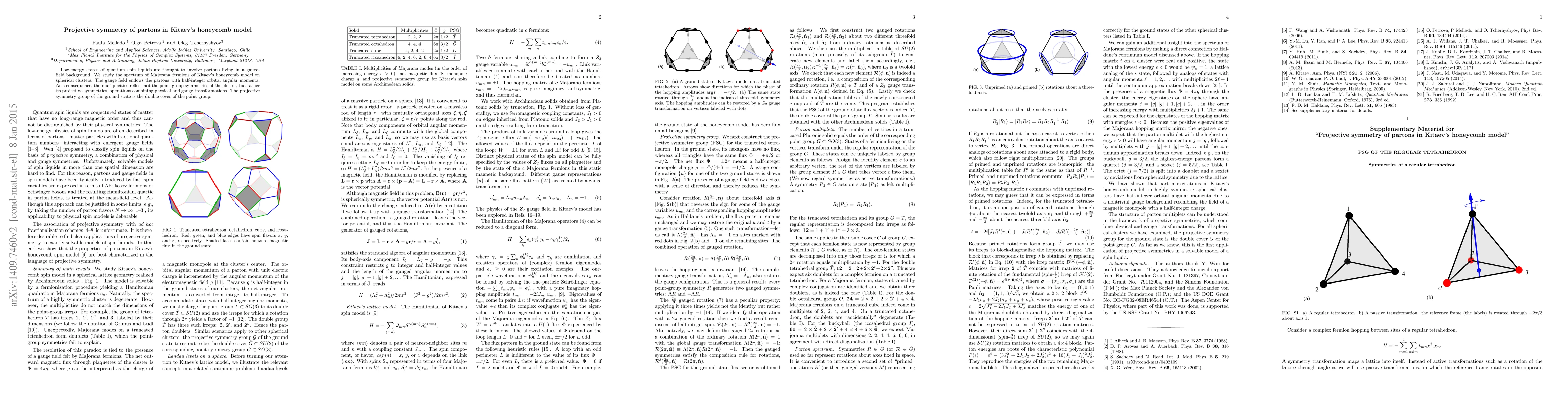 This paper investigates the spectrum of Majorana fermions in Kitaev's honeycomb model, revealing that partons exhibit half-integer orbital angular momenta due to the gauge field. The study finds that the multiplicities of states reflect the projective symmetries rather than the point-group symmetries of the cluster, with the ground state's projective symmetry group being the double cover of the point group.