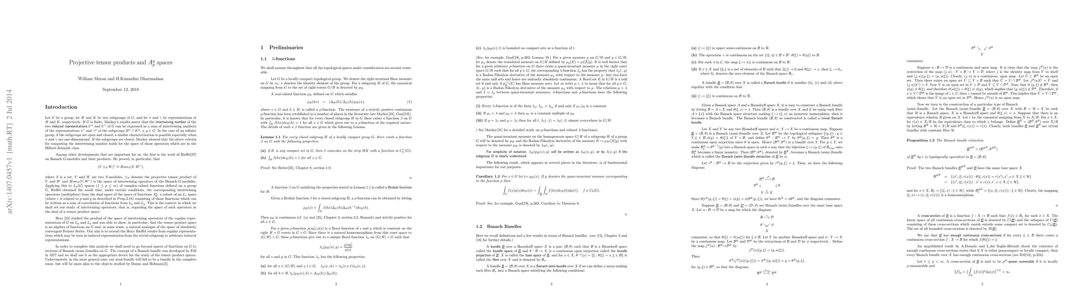 The aim of this paper is to extend the notion of Apq space from its historical context in the work of Herz and to recognise such spaces as preduals of spaces of intertwining operators of induced representations as suggested by the work of Rieffel. This generalisation of Apq spaces involves considering projective tensor products of Lp spaces of Banach space-valued functions (the spaces of induced representations) and constructing a convolution of functions of such spaces. Sufficient conditions for the existence of the integral of the convolution are established. Most of this analysis depends upon an identity we derive of Radon-Nikodym derivatives of measures on homogeneous spaces involved. The elements of the generalised Apq space are shown to be cross-sections of a Banach semi-bundle over the double coset space corresponding to the groups from which the representations are induced, and their properties are duly discussed. In particular, the generalised form of the classical result Lp*Lq is a subset of Lr; where 1/r = 1/p + 1/q - 1; is shown to be true in this situation. The result that the Apq space is the predual of the space of intertwining operators is then established, under the condition that the intertwining operators can be approximated, in the ultraweak operator topology, by integral operators.
