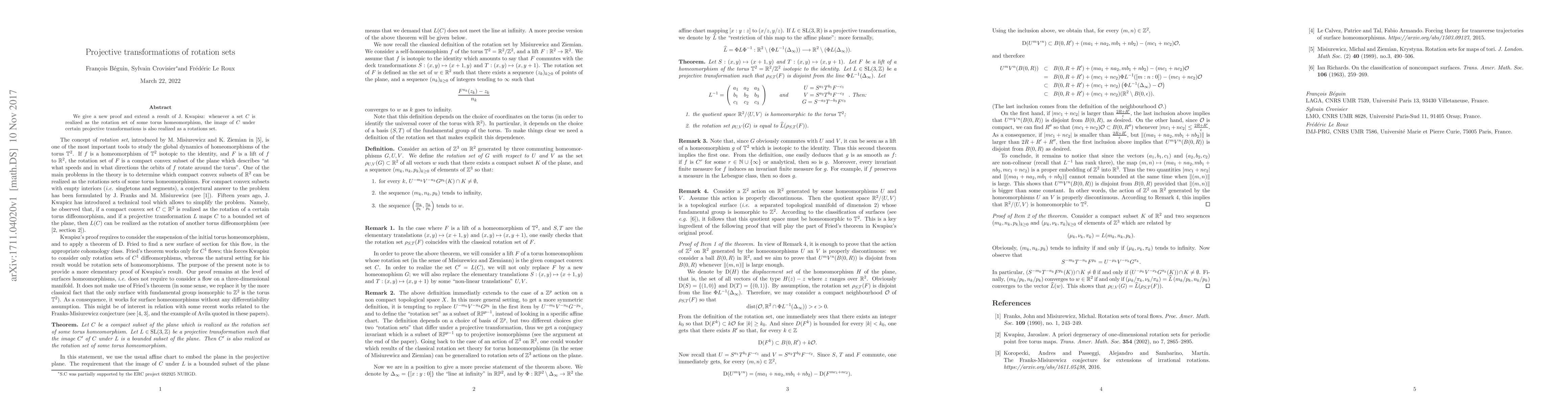 Researchers prove that applying specific projective transformations to a rotation set of a torus homeomorphism preserves its rotational properties, extending previous findings.