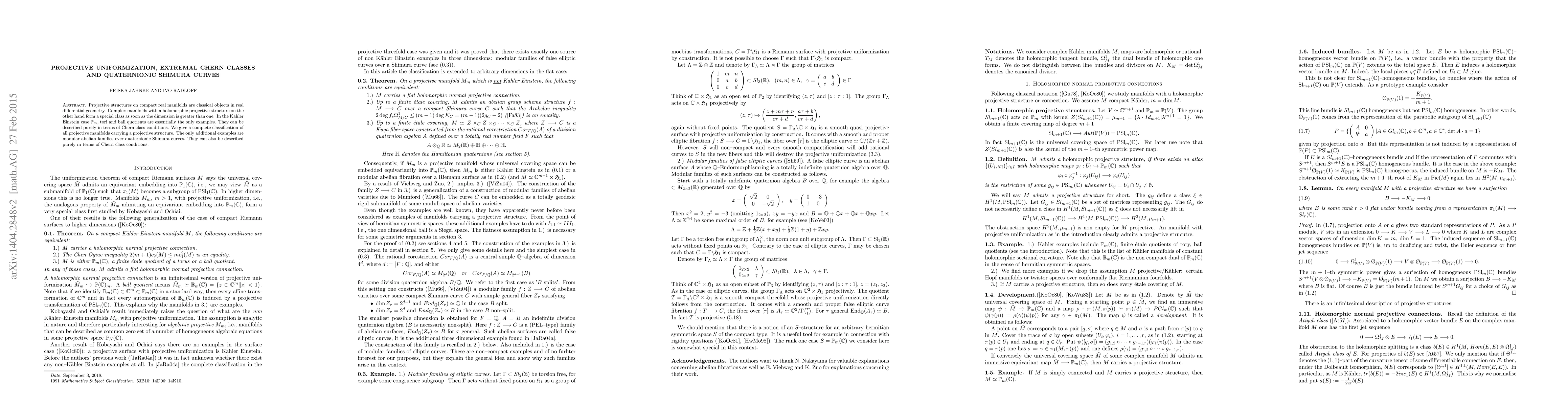 Projective structures on compact real manifolds are classical objects in real differential geometry. Complex manifolds with a holomorphic projective structure on the other hand form a special class as soon as the dimension is greater than one. In the K\"ahler Einstein case, projective space, tori and ball quotients are essentially the only examples. They can be described purely in terms of Chern class conditions. We give a complete classification of all projective manifolds carrying a projective structure. The only additional examples are modular abelian families over quaternionic Shimura curves. They can also be described purely in terms of Chern class conditions.