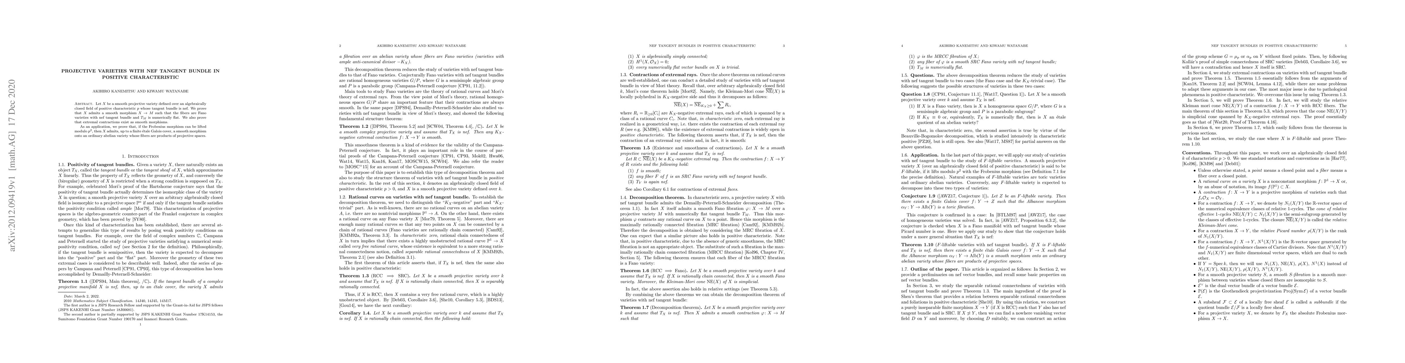 Summary: The paper proves that smooth projective varieties with nef tangent bundles in positive characteristic admit smooth morphisms to numerically flat varieties, with fibers being Fano varieties. Additionally, it demonstrates that such varieties can be mapped to ordinary abelian varieties under certain conditions.