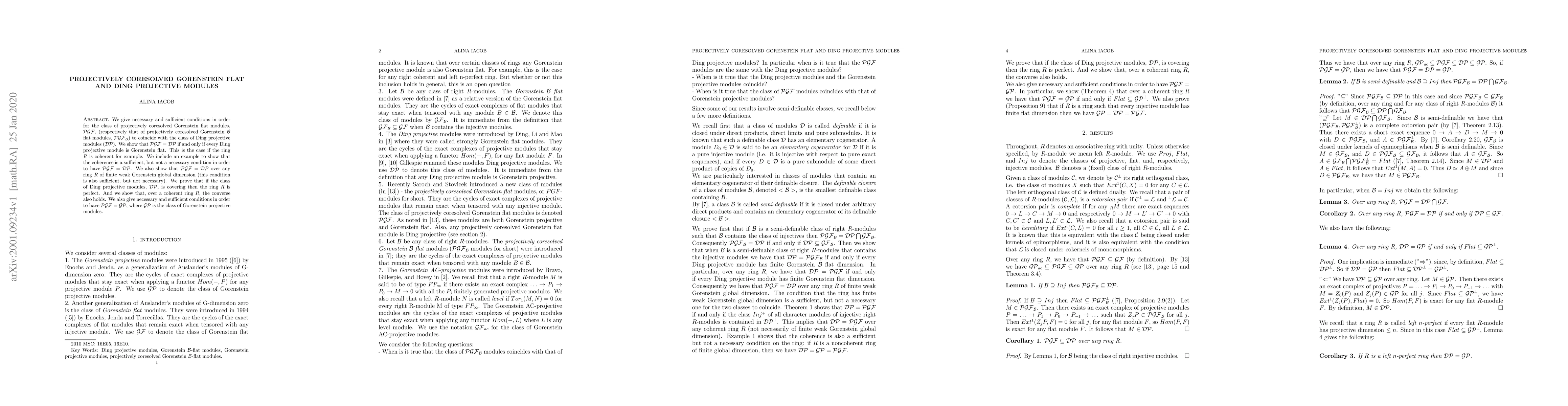 We give necessary and sufficient conditions in order for the class of projectively coresolved Gorenstein flat modules, $\mathcal{PGF}$, (respectively that of projectively coresolved Gorenstein $\mathcal{B}$ flat modules, $\mathcal{PGF}_{\mathcal{B}}$) to coincide with the class of Ding projective modules ($\mathcal{DP})$. We show that $\mathcal{PGF} = \mathcal{DP}$ if and only if every Ding projective module is Gorenstein flat. This is the case if the ring $R$ is coherent for example. We include an example to show that the coherence is a sufficient, but not a necessary condition in order to have $\mathcal{PGF} = \mathcal{DP}$. We also show that $\mathcal{PGF} = \mathcal{DP}$ over any ring $R$ of finite weak Gorenstein global dimension (this condition is also sufficient, but not necessary). We prove that if the class of Ding projective modules, $\mathcal{DP}$, is covering then the ring $R$ is perfect. And we show that, over a coherent ring $R$, the converse also holds. We also give necessary and sufficient conditions in order to have $\mathcal{PGF} = \mathcal{GP}$, where $\mathcal{GP}$ is the class of Gorenstein projective modules.