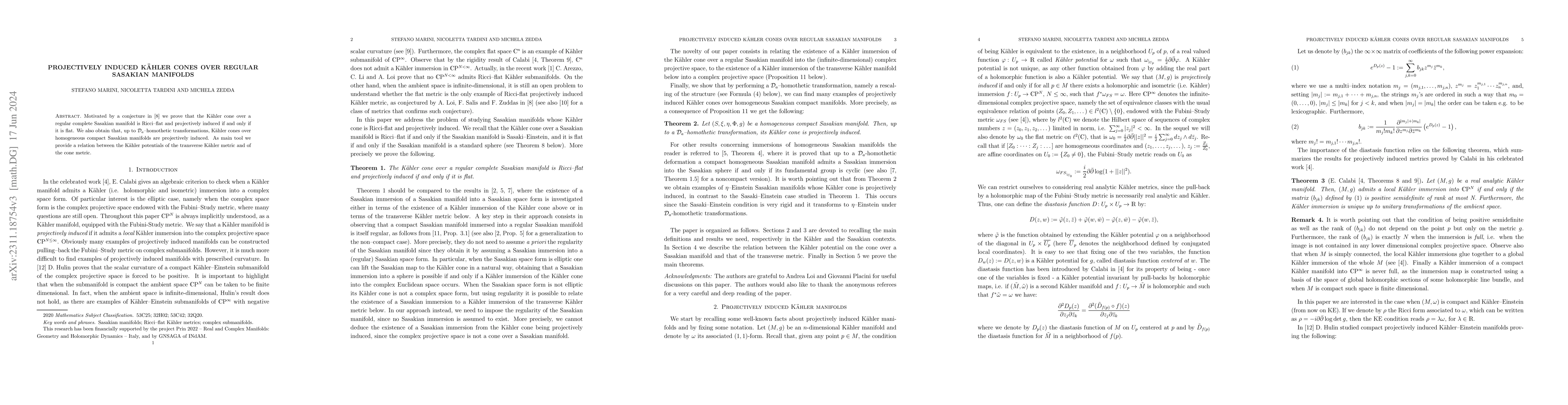 The paper proves that the Kähler cone over a regular complete Sasakian manifold is Ricci-flat and projectively induced if and only if it is flat. It also shows that Kähler cones over homogeneous compact Sasakian manifolds are projectively induced up to homothetic transformations, using a relation between their Kähler potentials.