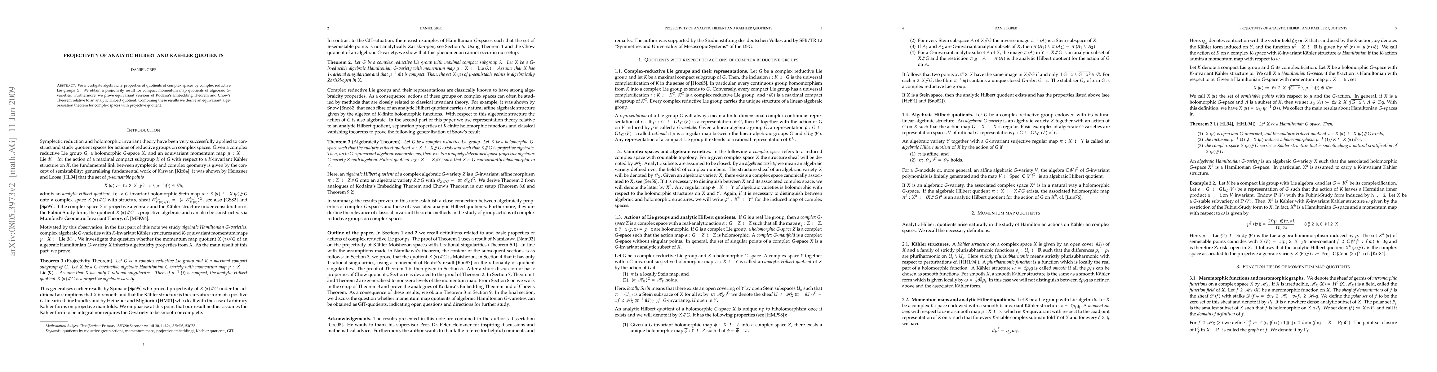 This paper proves the projectivity of compact momentum map quotients of algebraic G-varieties and establishes equivariant versions of Kodaira's and Chow's theorems relative to an analytic Hilbert quotient, leading to an equivariant algebraisation theorem for complex spaces with projective quotient.