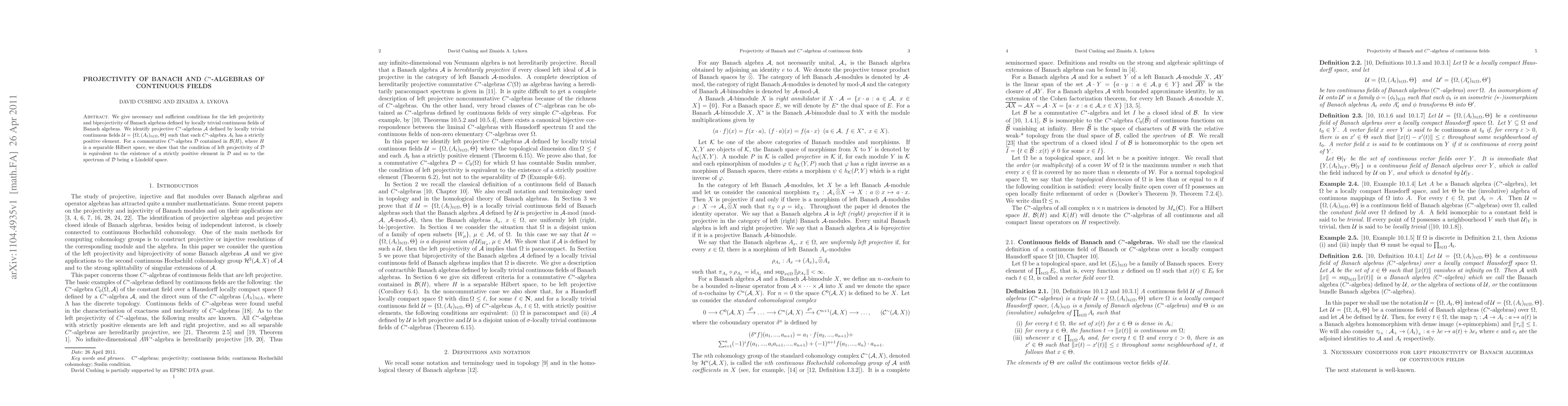 This paper provides necessary and sufficient conditions for the left projectivity and biprojectivity of Banach algebras from locally trivial continuous fields. It also identifies projective $C^*$-algebras with strictly positive elements and shows that left projectivity of commutative $C^*$-algebras in ${\cal B}(H)$ is equivalent to having a strictly positive element and a Lindel$\ddot{\rm o}$f spectrum.