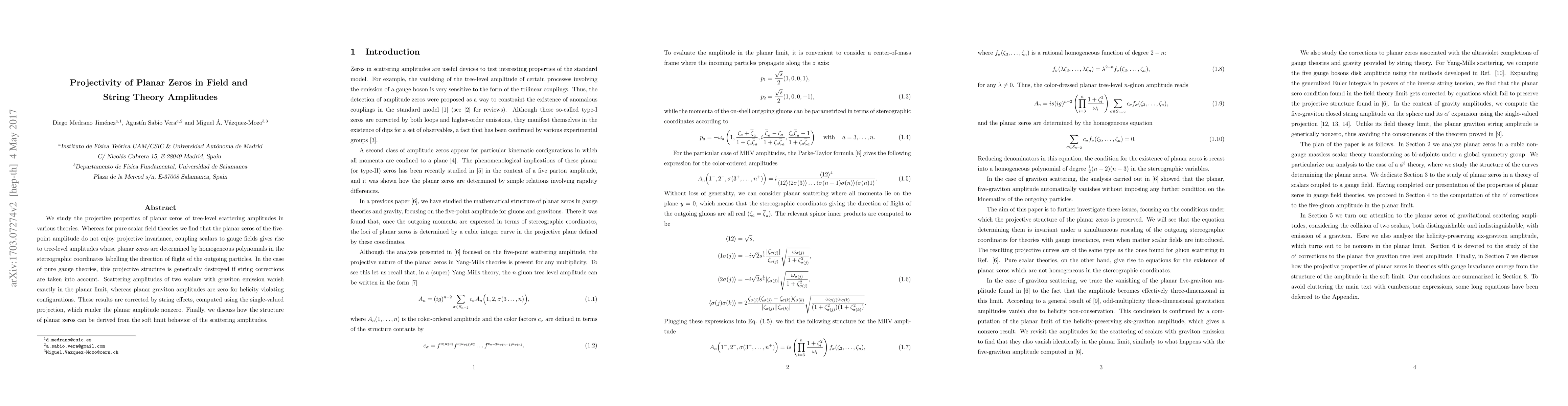 Research explores projective properties of planar zeros in field and string theory amplitudes, finding that coupling scalars to gauge fields creates a projective structure that is destroyed by string corrections.