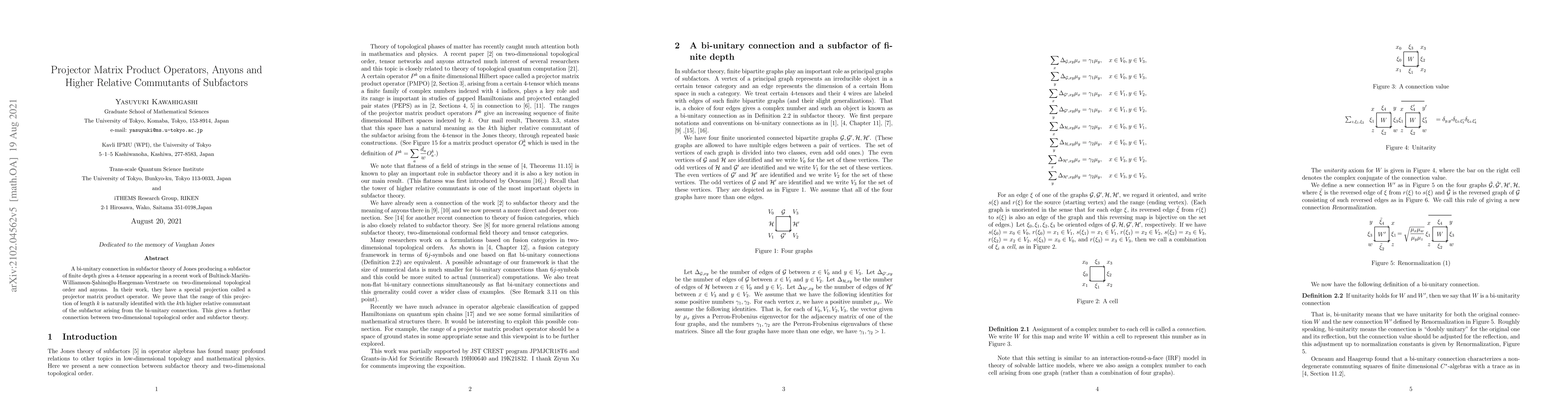 A bi-unitary connection in subfactor theory of Jones producing a subfactor of finite depth gives a 4-tensor appearing in a recent work of Bultinck-Mariena-Williamson-Sahinoglu-Haegemana-Verstraete on 2-dimensional topological order and anyons. In their work, they have a special projection called a projector matrix product operator. We prove that the range of this projection of length k is naturally identified with the k-th higher relative commutant of the subfactor arising from the bi-unitary connection. This gives a further connection between 2-dimensional topological order and subfactor theory.