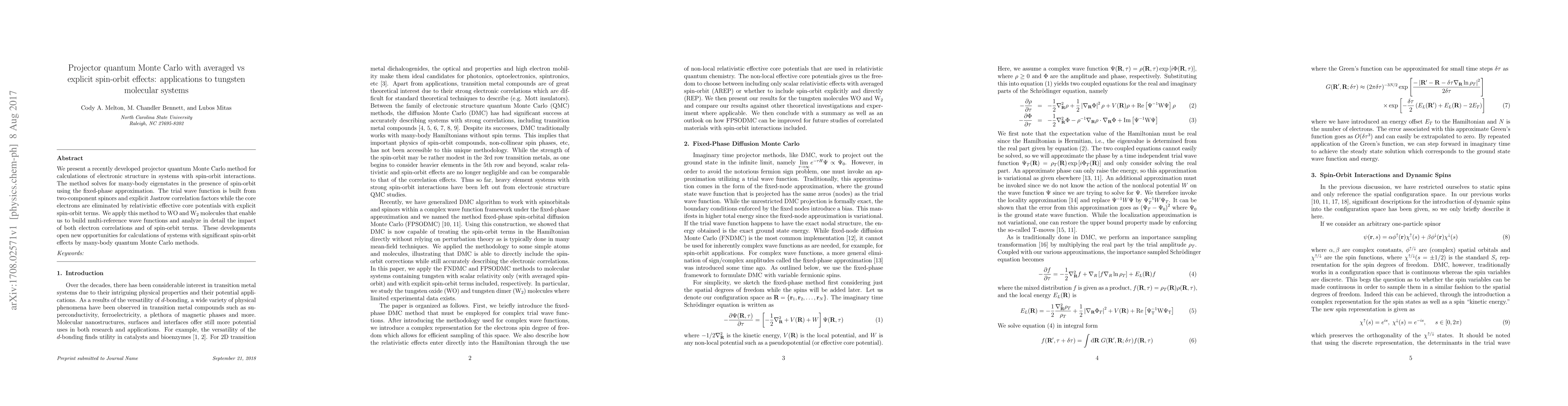 We present a recently developed projector quantum Monte Carlo method for calculations of electronic structure in systems with spin-orbit interactions. The method solves for many-body eigenstates in the presence of spin-orbit using the fixed-phase approximation.The trial wave function is built from two-component spinors and explicit Jastrow correlation factors while the core electrons are eliminated by relativistic effective core potentials with explicit spin-orbit terms. We apply this method to WO and W$_2$ molecules that enable us to build multi-reference wave functions and analyze in detail the impact of both electron correlations and of spin-orbit terms. These developments open new opportunities for calculations of systems with significant spin-orbit effects by many-body quantum Monte Carlo methods.