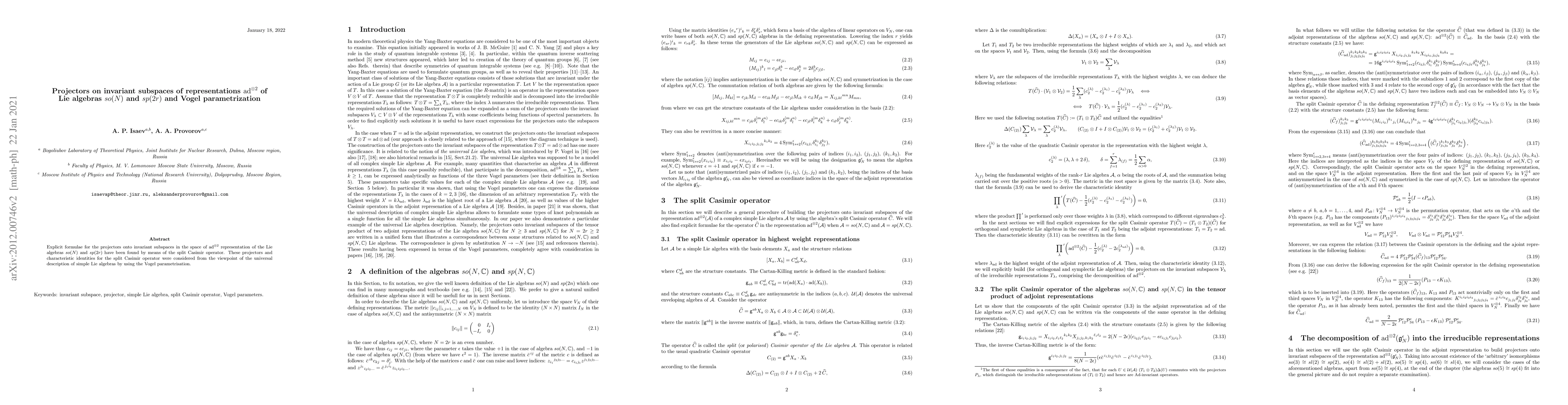 The research derives explicit formulae for projectors onto invariant subspaces of the $\operatorname{ad}^{\otimes 2}$ representation of Lie algebras $so(N)$ and $sp(2r)$ using the split Casimir operator. It also examines these projectors through the lens of the universal complex simple Lie algebra description via Vogel parametrization.