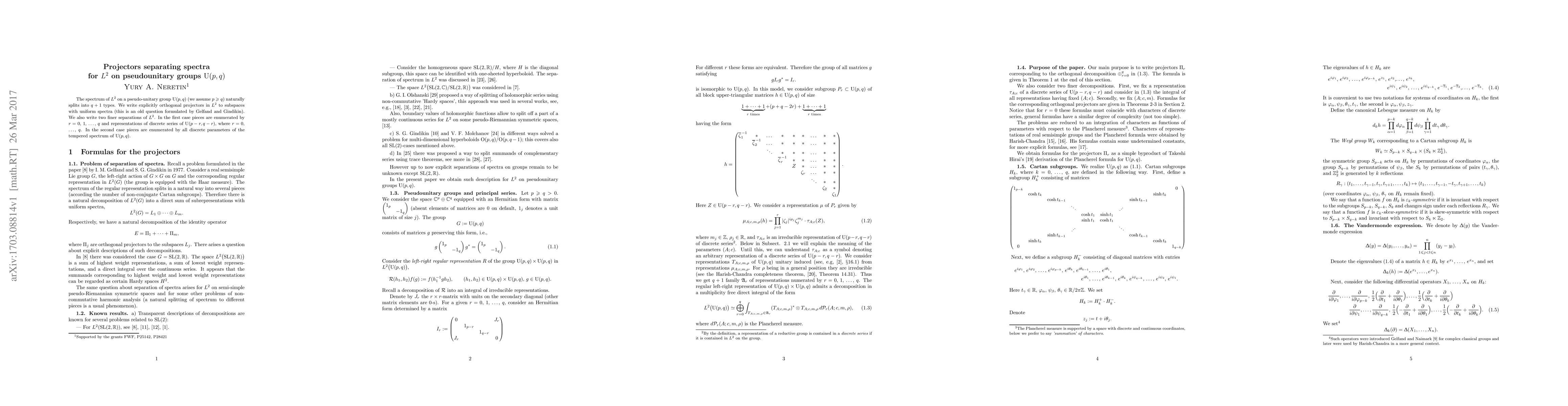 This paper explores the spectrum of $L^2$ on pseudounitary groups $U(p,q)$, demonstrating its splitting into $q+1$ types and providing explicit orthogonal projectors for subspaces with uniform spectra. It also introduces two finer separations of $L^2$ based on discrete series representations and the tempered spectrum.