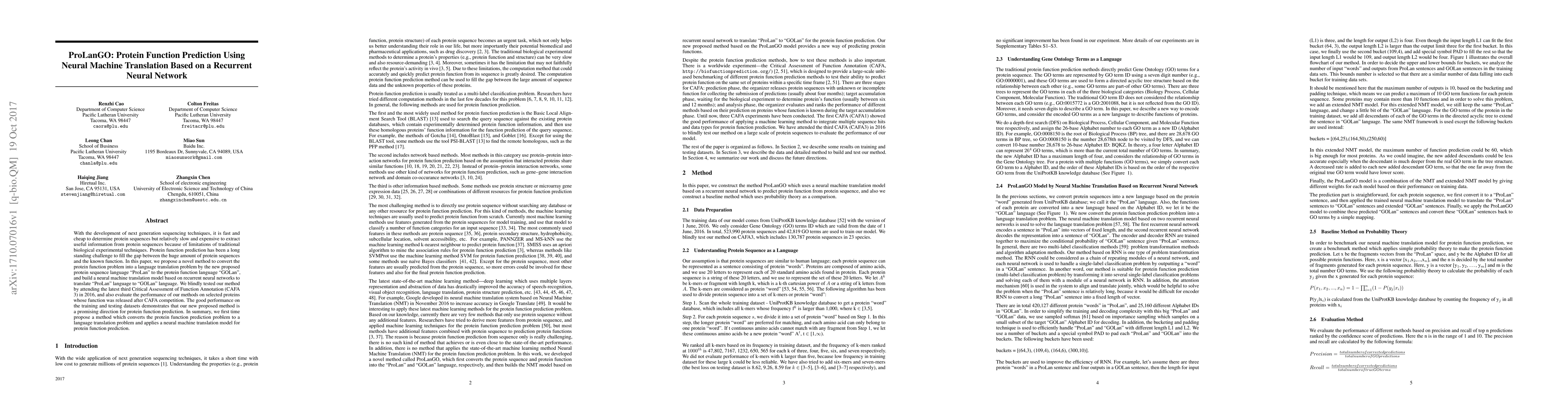 This paper introduces ProLanGO, a novel method using neural machine translation based on recurrent neural networks to predict protein functions by translating protein sequences into functional language. The method shows promising results in the CAFA 3 competition and on post-competition released protein functions.