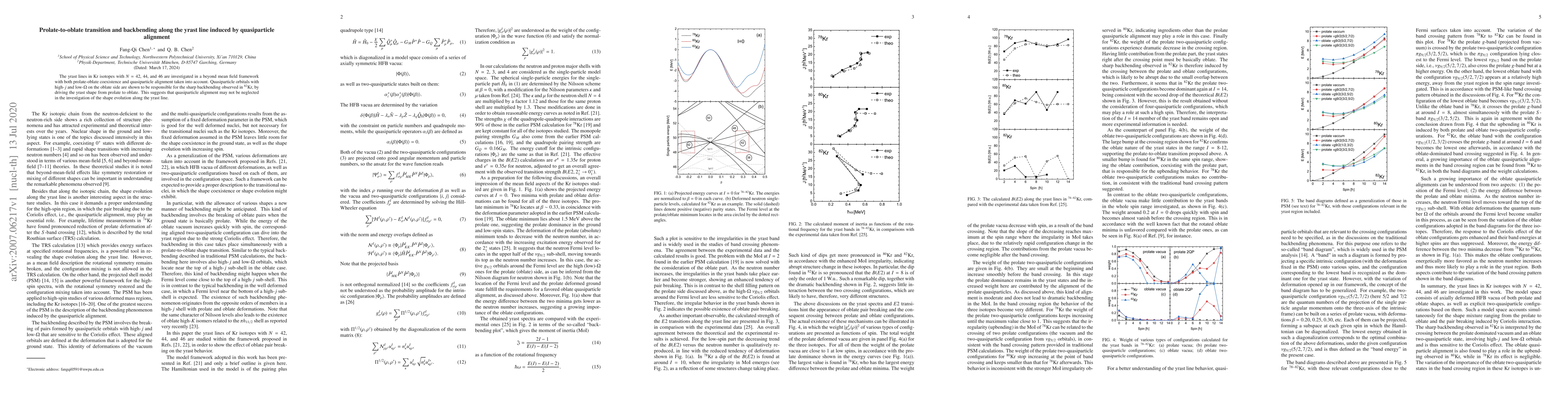 Summary: The study investigates the shape transition in Kr isotopes, revealing that quasiparticle alignment, particularly high-$j$ orbitals on the oblate side, induces a prolate-to-oblate transition and backbending in the yrast line, highlighting the importance of quasiparticle effects in nuclear shape evolution.