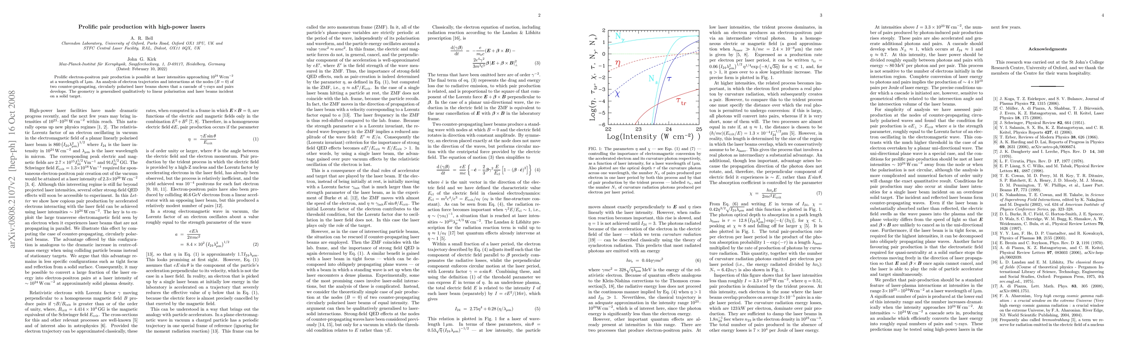 Prolific electron-positron pair production is possible at laser intensities approaching 10^{24} W/cm^2 at a wavelength of 1 micron. An analysis of electron trajectories and interactions at the nodes (B=0) of two counter-propagating, circularly polarised laser beams shows that a cascade of gamma-rays and pairs develops. The geometry is generalised qualitatively to linear polarisation and laser beams incident on a solid target.