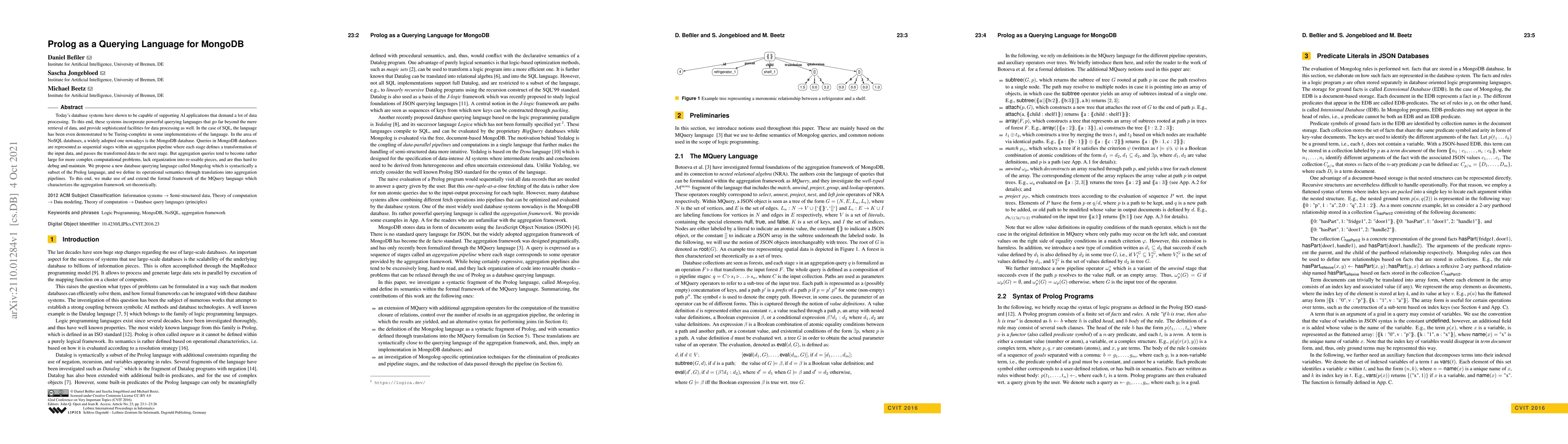 Today's database systems have shown to be capable of supporting AI applications that demand a lot of data processing. To this end, these systems incorporate powerful querying languages that go far beyond the mere retrieval of data, and provide sophisticated facilities for data processing as well. In the case of SQL, the language has been even demonstrated to be Turing-complete in some implementations of the language. In the area of NoSQL databases, a widely adopted one nowadays is the MongoDB database. Queries in MongoDB databases are represented as sequential stages within an aggregation pipeline where each stage defines a transformation of the input data, and passes the transformed data to the next stage. But aggregation queries tend to become rather large for more complex computational problems, lack organization into re-usable pieces, and are thus hard to debug and maintain. We propose a new database querying language called Mongolog which is syntactically a subset of the Prolog language, and we define its operational semantics through translations into aggregation pipelines. To this end, we make use of and extend the formal framework of the MQuery language which characterizes the aggregation framework set-theoretically.