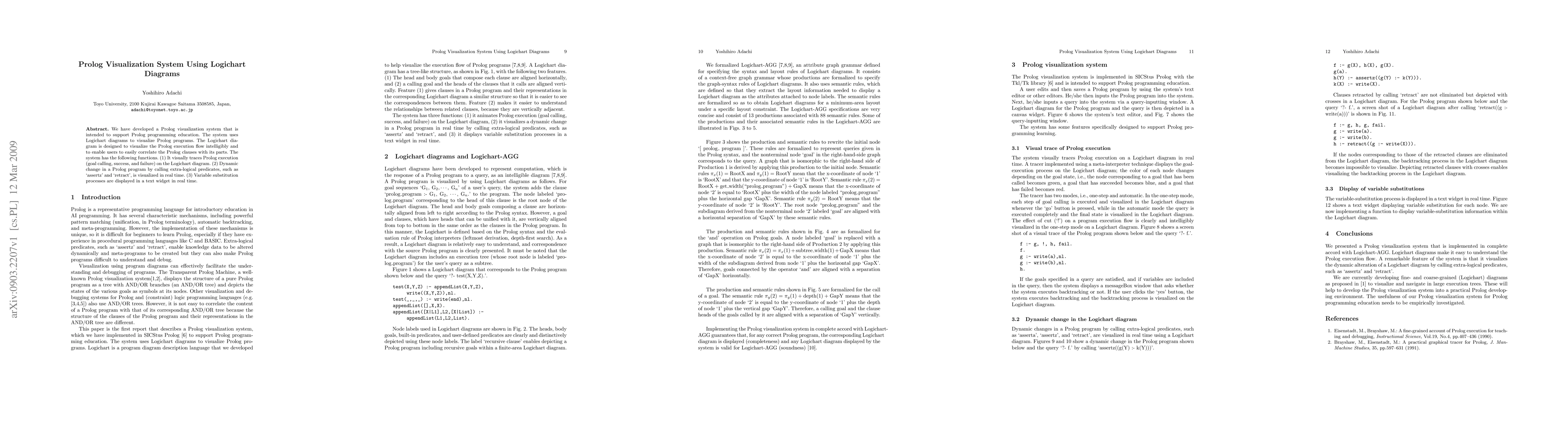We have developed a Prolog visualization system that is intended to support Prolog programming education. The system uses Logichart diagrams to visualize Prolog programs. The Logichart diagram is designed to visualize the Prolog execution flow intelligibly and to enable users to easily correlate the Prolog clauses with its parts. The system has the following functions. (1) It visually traces Prolog execution (goal calling, success, and failure) on the Logichart diagram. (2) Dynamic change in a Prolog program by calling extra-logical predicates, such as `assertz' and `retract', is visualized in real time. (3) Variable substitution processes are displayed in a text widget in real time.