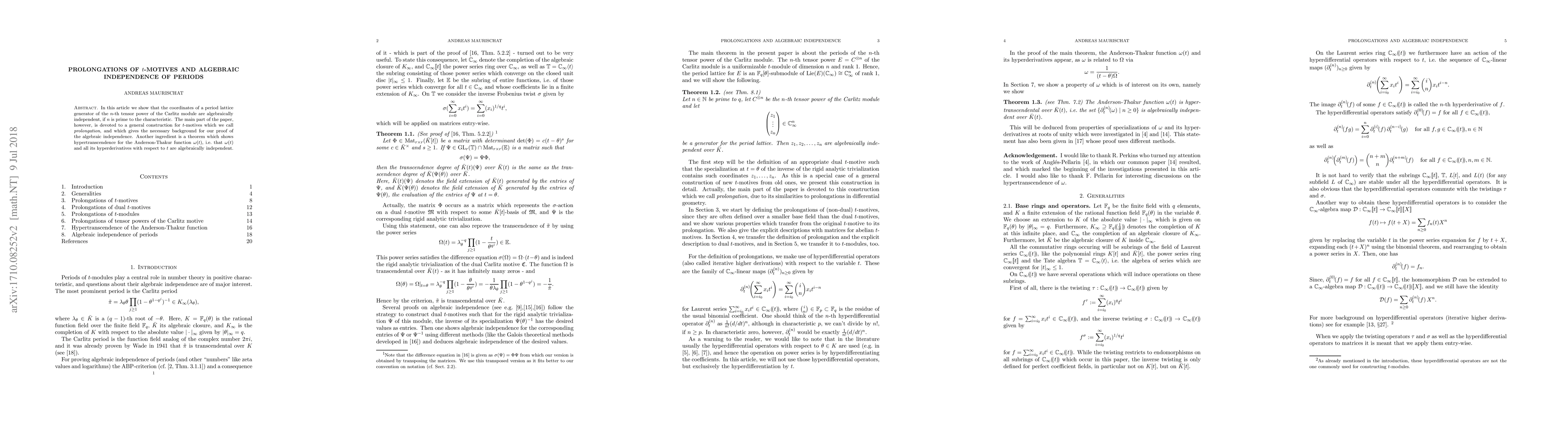 In this article we show that the coordinates of a period lattice generator of the $n$-th tensor power of the Carlitz module are algebraically independent, if $n$ is prime to the characteristic. The main part of the paper, however, is devoted to a general construction for $t$-motives which we call prolongation, and which gives the necessary background for our proof of the algebraic independence. Another ingredient is a theorem which shows hypertranscendence for the Anderson-Thakur function $\omega(t)$, i.e. that $\omega(t)$ and all its hyperderivatives with respect to $t$ are algebraically independent.