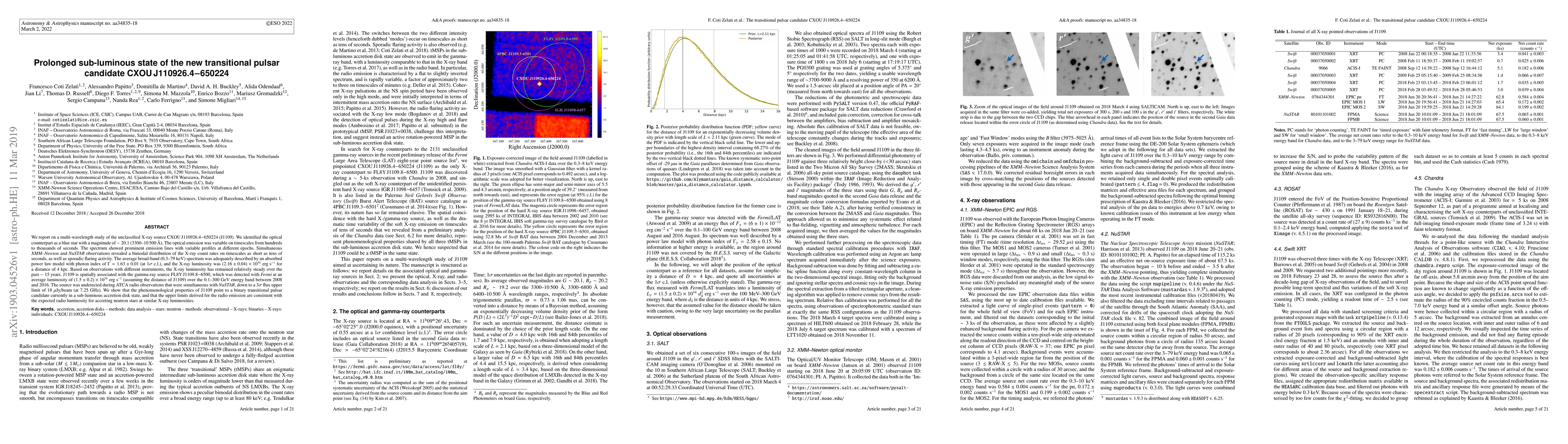 This paper reports on the multi-wavelength study of CXOU J110926.4-650224, identifying it as a blue star with variable optical emission and a steady X-ray luminosity over 15 years, suggesting it is a transitional pulsar candidate in a sub-luminous state, with no detectable radio emission.