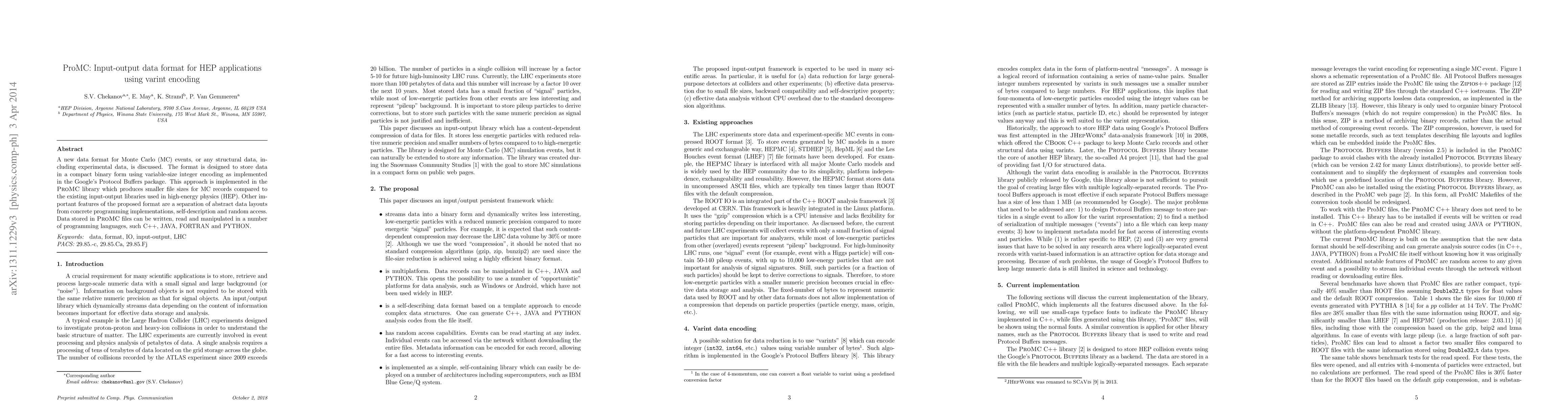 A new data format for Monte Carlo (MC) events, or any structural data, including experimental data, is discussed. The format is designed to store data in a compact binary form using variable-size integer encoding as implemented in the Google's Protocol Buffers package. This approach is implemented in the ProMC library which produces smaller file sizes for MC records compared to the existing input-output libraries used in high-energy physics (HEP). Other important features of the proposed format are a separation of abstract data layouts from concrete programming implementations, self-description and random access. Data stored in ProMC files can be written, read and manipulated in a number of programming languages, such C++, JAVA, FORTRAN and PYTHON.