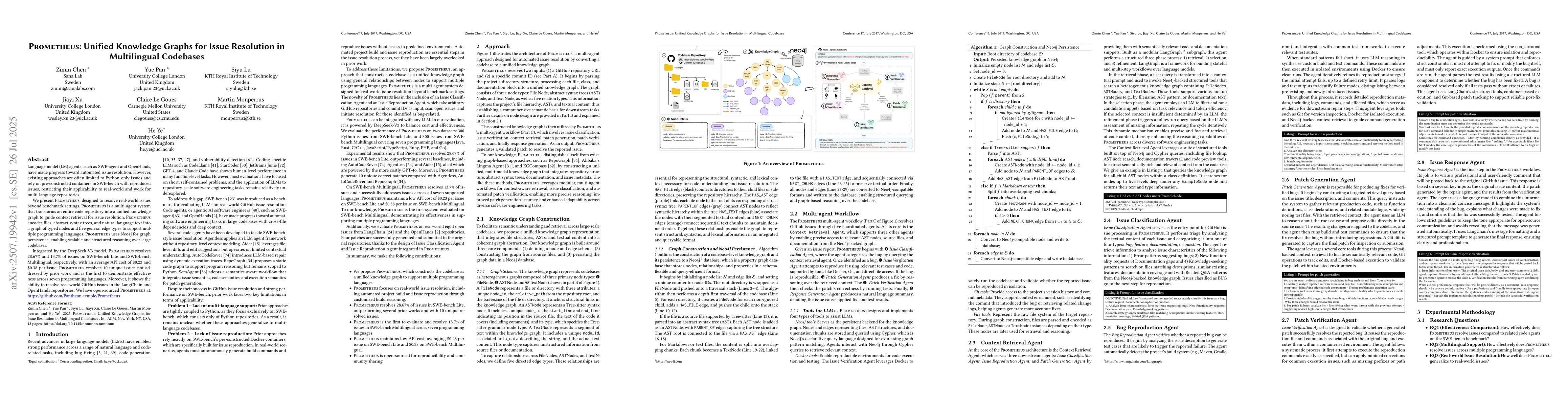 Language model (LM) agents, such as SWE-agent and OpenHands, have made progress toward automated issue resolution. However, existing approaches are often limited to Python-only issues and rely on pre-constructed containers in SWE-bench with reproduced issues, restricting their applicability to real-world and work for multi-language repositories. We present Prometheus, designed to resolve real-world issues beyond benchmark settings. Prometheus is a multi-agent system that transforms an entire code repository into a unified knowledge graph to guide context retrieval for issue resolution. Prometheus encodes files, abstract syntax trees, and natural language text into a graph of typed nodes and five general edge types to support multiple programming languages. Prometheus uses Neo4j for graph persistence, enabling scalable and structured reasoning over large codebases. Integrated by the DeepSeek-V3 model, Prometheus resolves 28.67% and 13.7% of issues on SWE-bench Lite and SWE-bench Multilingual, respectively, with an average API cost of $0.23 and $0.38 per issue. Prometheus resolves 10 unique issues not addressed by prior work and is the first to demonstrate effectiveness across seven programming languages. Moreover, it shows the ability to resolve real-world GitHub issues in the LangChain and OpenHands repositories. We have open-sourced Prometheus at: https://github.com/Pantheon-temple/Prometheus