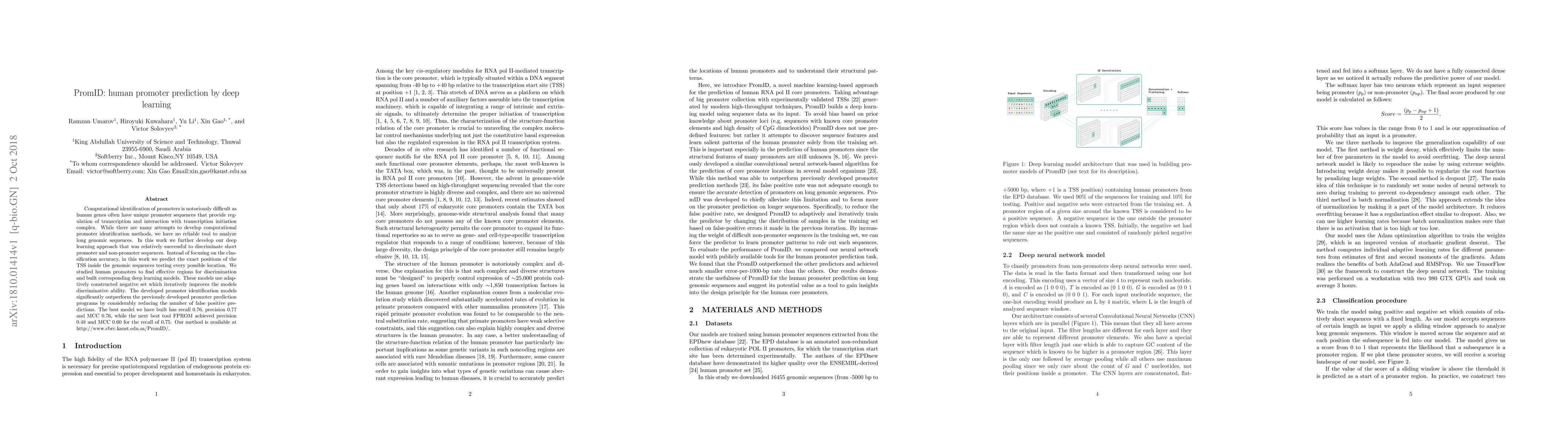 Computational identification of promoters is notoriously difficult as human genes often have unique promoter sequences that provide regulation of transcription and interaction with transcription initiation complex. While there are many attempts to develop computational promoter identification methods, we have no reliable tool to analyze long genomic sequences. In this work we further develop our deep learning approach that was relatively successful to discriminate short promoter and non-promoter sequences. Instead of focusing on the classification accuracy, in this work we predict the exact positions of the TSS inside the genomic sequences testing every possible location. We studied human promoters to find effective regions for discrimination and built corresponding deep learning models. These models use adaptively constructed negative set which iteratively improves the models discriminative ability. The developed promoter identification models significantly outperform the previously developed promoter prediction programs by considerably reducing the number of false positive predictions. The best model we have built has recall 0.76, precision 0.77 and MCC 0.76, while the next best tool FPROM achieved precision 0.48 and MCC 0.60 for the recall of 0.75. Our method is available at http://www.cbrc.kaust.edu.sa/PromID/.