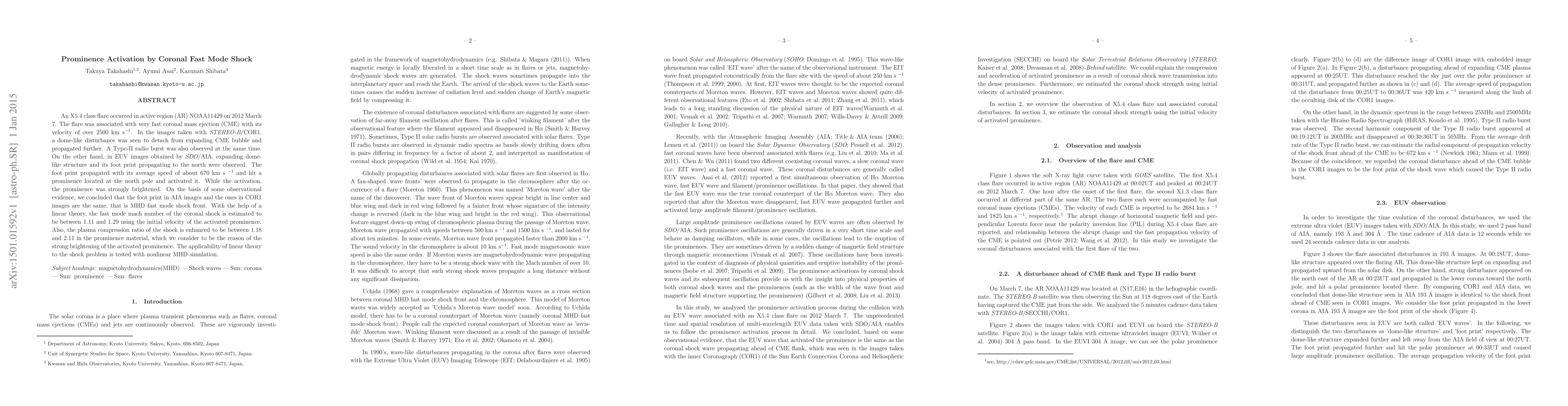 An X5.4 class flare occurred in active region (AR) NOAA11429 on 2012 March 7. The flare was associated with very fast coronal mass ejection (CME) with its velocity of over 2500 km/s. In the images taken with STEREO-B/COR1, a dome-like disturbance was seen to detach from expanding CME bubble and propagated further. A Type-II radio burst was also observed at the same time. On the other hand, in EUV images obtained by SDO/AIA, expanding dome-like structure and its foot print propagating to the north were observed. The foot print propagated with its average speed of about 670 km/s and hit a prominence located at the north pole and activated it. While the activation, the prominence was strongly brightened. On the basis of some observational evidence, we concluded that the foot print in AIA images and the ones in COR1 images are the same, that is MHD fast mode shock front. With the help of a linear theory, the fast mode mach number of the coronal shock is estimated to be between 1.11 and 1.29 using the initial velocity of the activated prominence. Also, the plasma compression ratio of the shock is enhanced to be between 1.18 and 2.11 in the prominence material, which we consider to be the reason of the strong brightening of the activated prominence. The applicability of linear theory to the shock problem is tested with nonlinear MHD simulation.