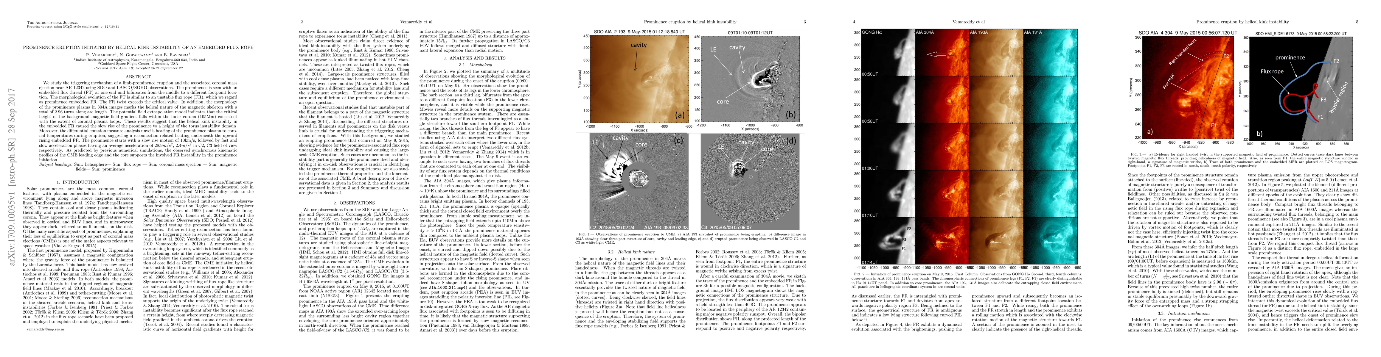 We study the triggering mechanism of a limb-prominence eruption and the associated coronal mass ejection near AR 12342 using SDO and LASCO/SOHO observations. The prominence is seen with an embedded flux thread (FT) at one end and bifurcates from the middle to a different footpoint location. The morphological evolution of the FT is similar to an unstable flux rope (FR), which we regard as prominence embedded FR. The FR twist exceeds the critical value. In addition, the morphology of the prominence plasma in 304\AA~images marks the helical nature of the magnetic skeleton with a total of 2.96 turns along arc length. The potential field extrapolation model indicates that the critical height of the background magnetic field gradient falls within the inner corona (105Mm) consistent with the extent of coronal plasma loops. These results suggest that the helical kink instability in the embedded FR caused the slow rise of the prominence to a height of the torus instability domain. Moreover, the differential emission measure analysis unveils heating of the prominence plasma to coronal temperatures during eruption, suggesting a reconnection-related heating underneath the upward rising embedded FR. The prominence starts with a slow rise motion of 10km/s, followed by fast and slow acceleration phases having an average acceleration of $28.9m/s^2$, $2.4m/s^2$ in C2, C3 field of view respectively. As predicted by previous numerical simulations, the observed synchronous kinematic profiles of the CME leading edge and the core supports the involved FR instability in the prominence initiation.