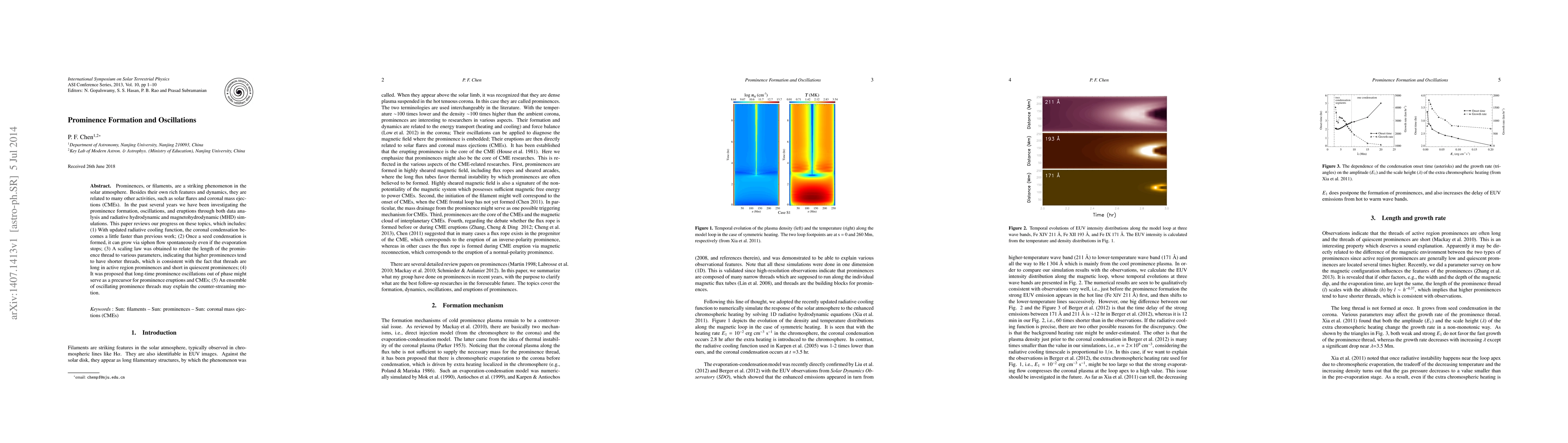 This paper reviews recent advances in understanding solar prominence formation, oscillations, and eruptions, highlighting faster coronal condensation, growth via siphon flow, a scaling law for prominence thread length, and the potential of long-time oscillations as precursors to eruptions and CMEs.