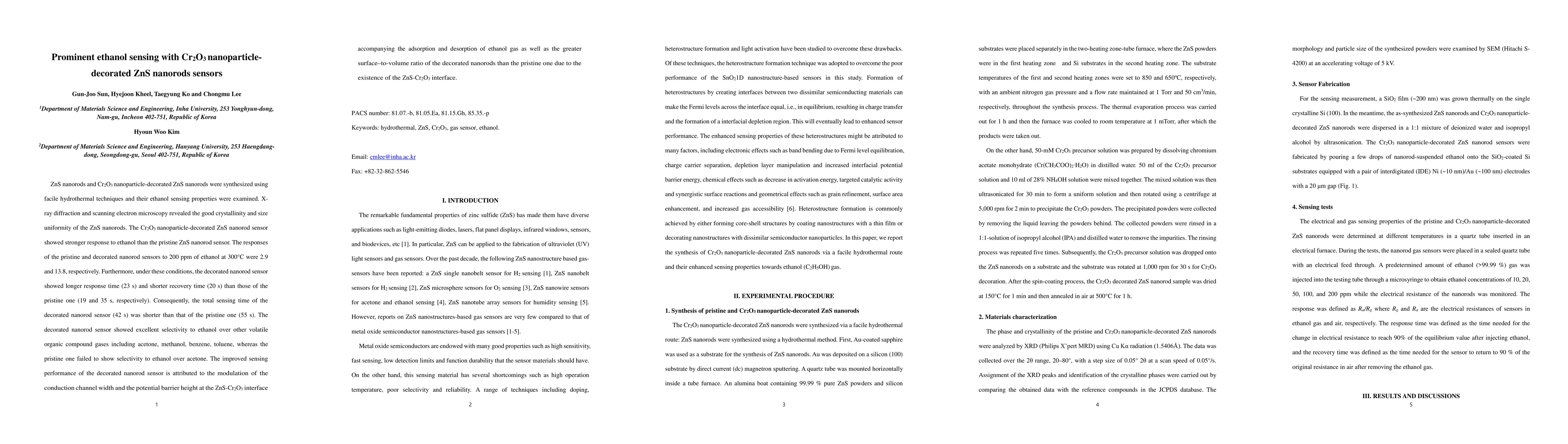 This study synthesizes Cr2O3 nanoparticle-decorated ZnS nanorods via hydrothermal techniques and evaluates their ethanol sensing properties. The decorated sensor exhibits a significantly higher response to ethanol (13.8 vs 2.9) and improved selectivity compared to the pristine ZnS nanorod sensor, attributed to enhanced surface area and modulation of the conduction channel at the ZnS-Cr2O3 interface.