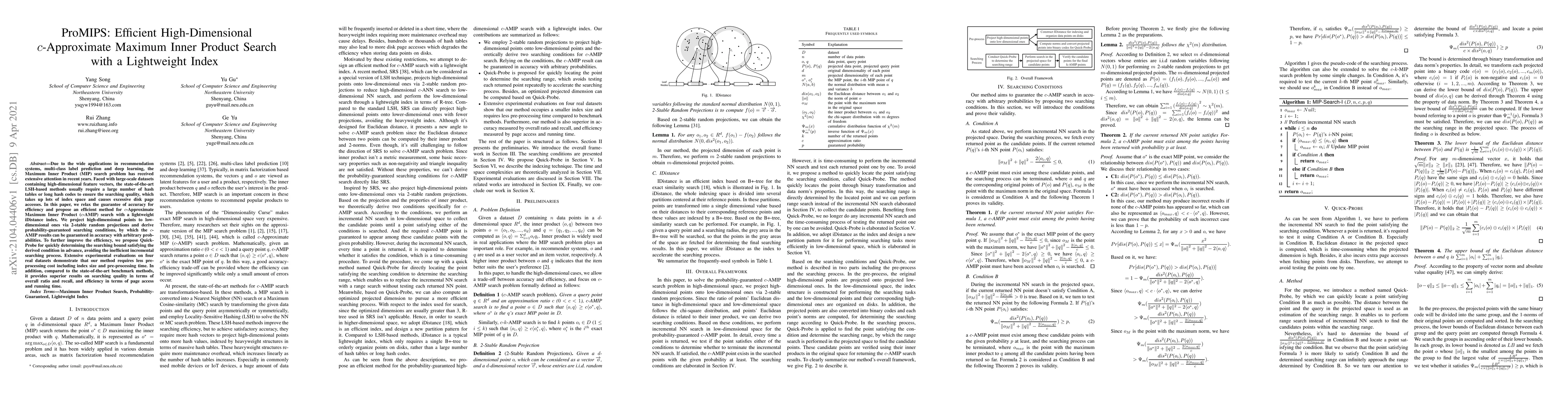 The technical contribution of this paper lies in the development of ProMIPS, an efficient c-AMIP search method with a lightweight iDistance index, Quick-Probe for efficient search bounds determination, and probability-guaranteed searching conditions derived via 2-stable random projections.
