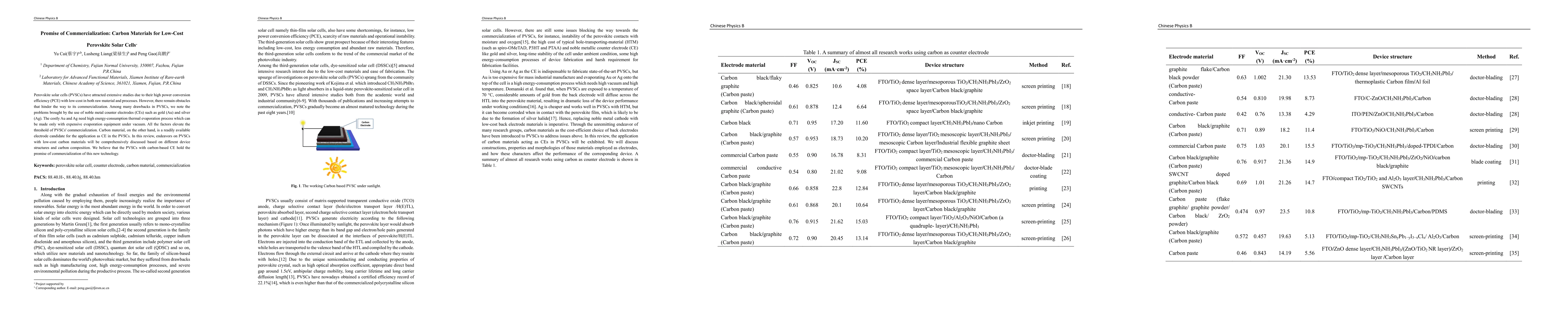 This paper reviews efforts to commercialize perovskite solar cells (PVSCs) by replacing costly noble metal counter electrodes with low-cost carbon materials, highlighting various device structures and carbon compositions to improve efficiency and reduce production costs. The use of carbon materials is seen as a promising solution to the commercialization challenges of PVSCs.