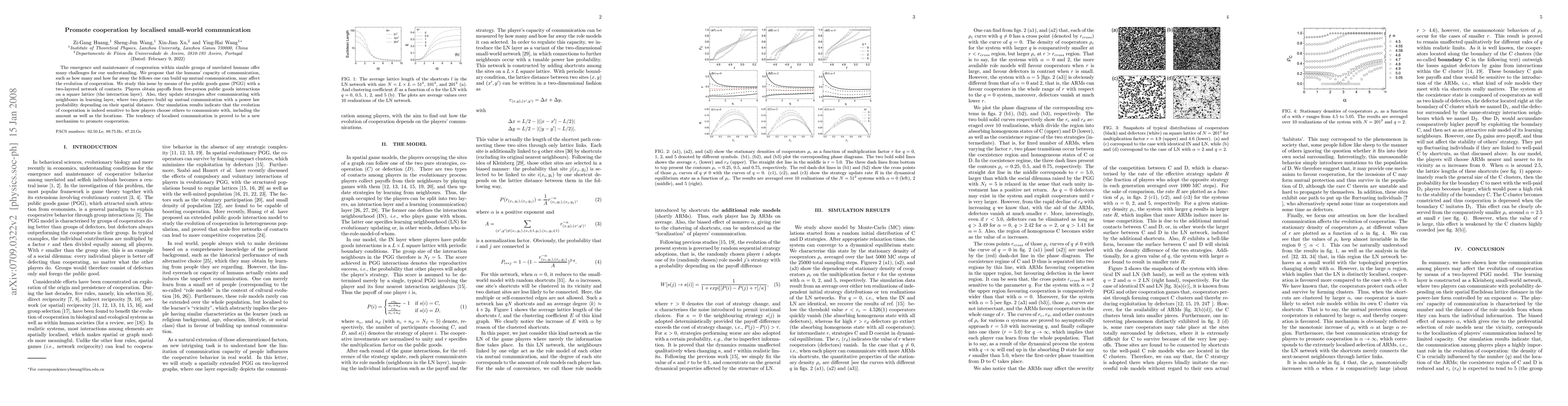 The emergence and maintenance of cooperation within sizable groups of unrelated humans offer many challenges for our understanding. We propose that the humans' capacity of communication, such as how many and how far away the fellows can build up mutual communications, may affect the evolution of cooperation. We study this issue by means of the public goods game (PGG) with a two-layered network of contacts. Players obtain payoffs from five-person public goods interactions on a square lattice (the interaction layer). Also, they update strategies after communicating with neighbours in learning layer, where two players build up mutual communication with a power law probability depending on their spatial distance. Our simulation results indicate that the evolution of cooperation is indeed sensitive to how players choose others to communicate with, including the amount as well as the locations. The tendency of localised communication is proved to be a new mechanism to promote cooperation.