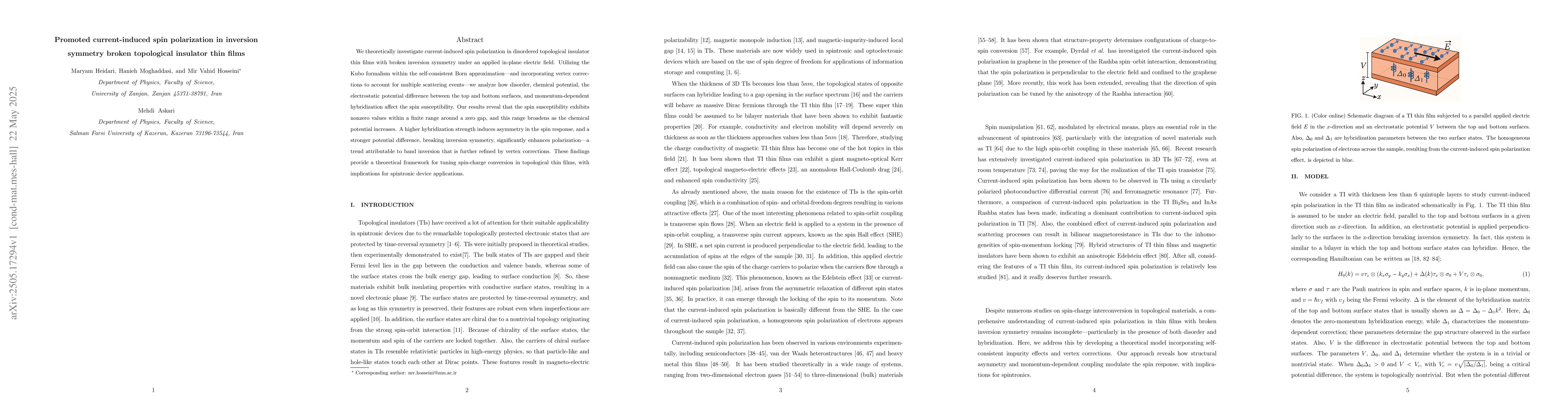 Researchers found that applying an electric field to topological insulator thin films with broken inversion symmetry can induce spin polarization, which can be controlled by factors such as disorder, chemical potential, and hybridization strength.