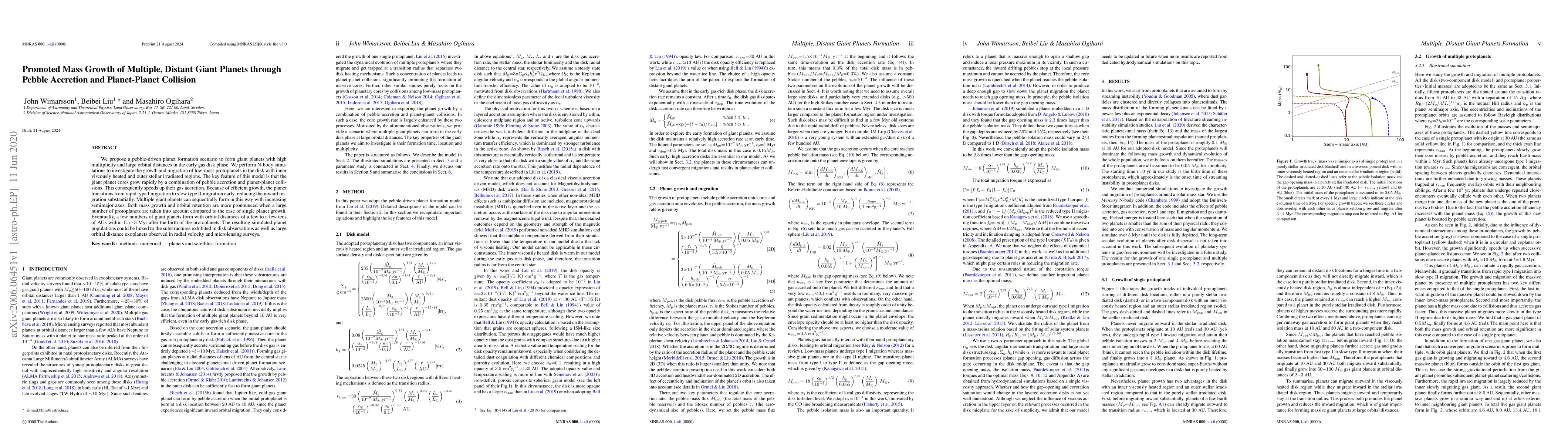 This paper proposes a model for the formation of multiple, distant giant planets through rapid core growth via pebble accretion and planet-planet collisions during the early gas disk phase. The simulations show that efficient growth leads to reduced inward migration and the formation of several giant planets at large orbital distances within a few million years.