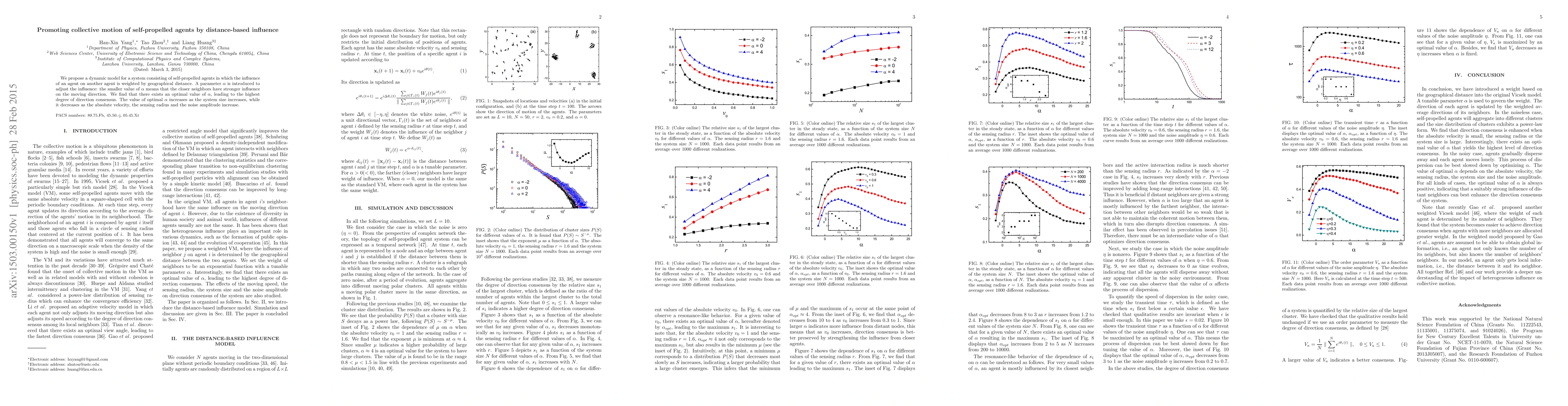 This paper introduces a dynamic model for self-propelled agents where influence is distance-dependent, with a parameter $\alpha$ determining the strength of this influence. An optimal $\alpha$ maximizes direction consensus, which increases with system size and decreases with higher velocities, sensing radii, and noise.
