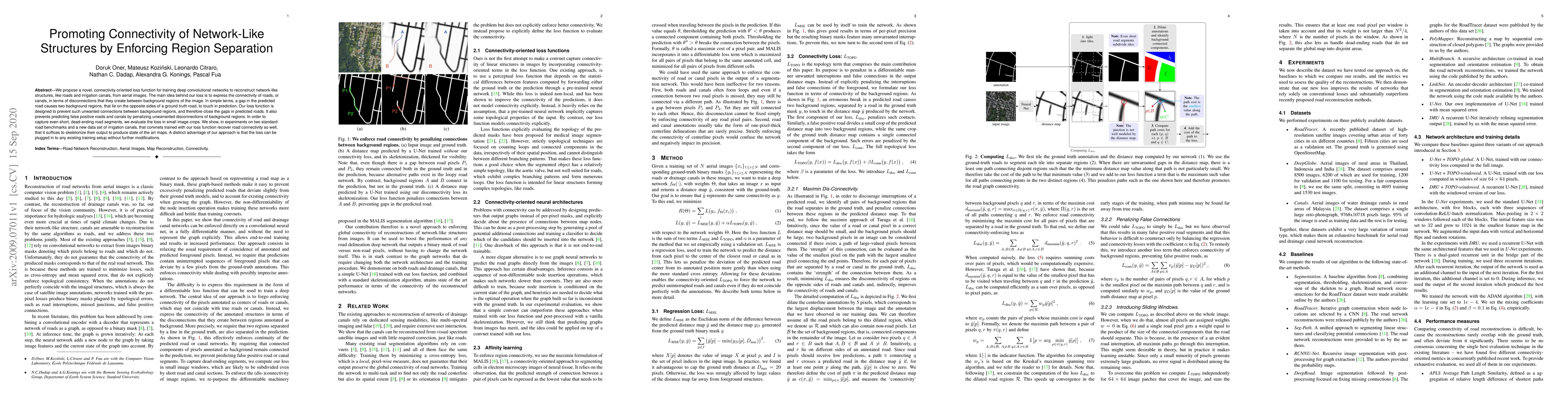 We propose a novel, connectivity-oriented loss function for training deep convolutional networks to reconstruct network-like structures, like roads and irrigation canals, from aerial images. The main idea behind our loss is to express the connectivity of roads, or canals, in terms of disconnections that they create between background regions of the image. In simple terms, a gap in the predicted road causes two background regions, that lie on the opposite sides of a ground truth road, to touch in prediction. Our loss function is designed to prevent such unwanted connections between background regions, and therefore close the gaps in predicted roads. It also prevents predicting false positive roads and canals by penalizing unwarranted disconnections of background regions. In order to capture even short, dead-ending road segments, we evaluate the loss in small image crops. We show, in experiments on two standard road benchmarks and a new data set of irrigation canals, that convnets trained with our loss function recover road connectivity so well, that it suffices to skeletonize their output to produce state of the art maps. A distinct advantage of our approach is that the loss can be plugged in to any existing training setup without further modifications.