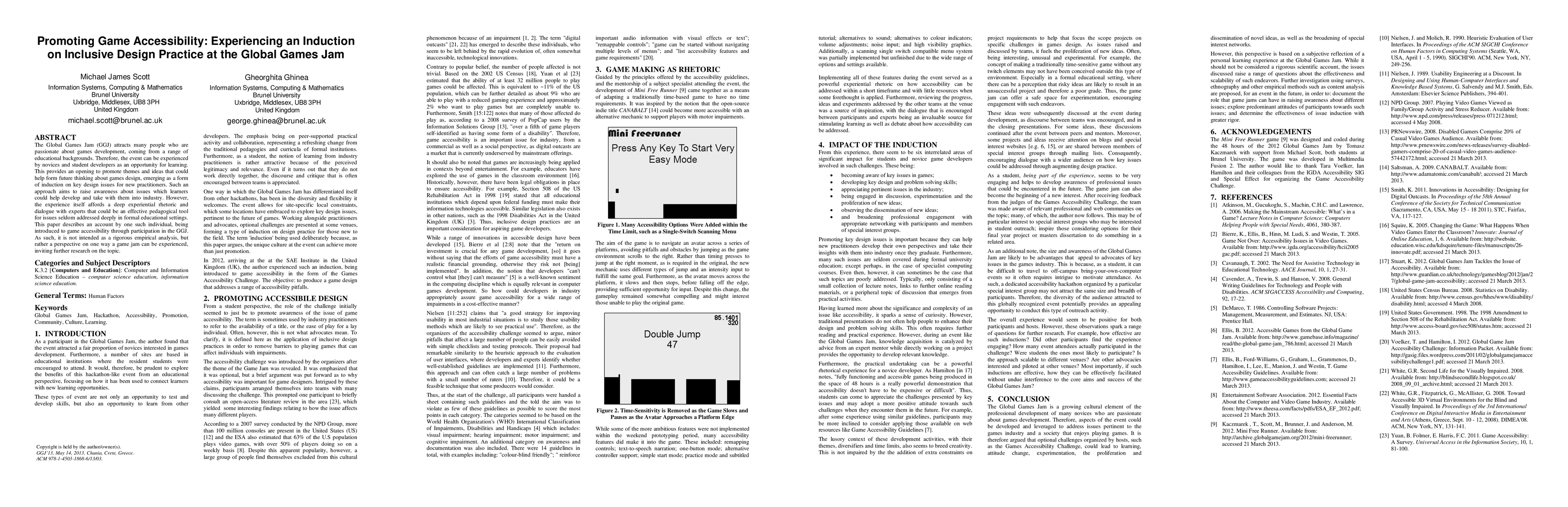 The Global Games Jam (GGJ) attracts many people who are passionate about games development, coming from a range of educational backgrounds. Therefore, the event can be experienced by novices and student developers as an opportunity for learning. This provides an opening to promote themes and ideas that could help form future thinking about games design, emerging as a form of induction on key design issues for new practitioners. Such an approach aims to raise awareness about issues which learners could help develop and take with them into industry. However, the experience itself affords a deep experiential rhetoric and dialogue with experts that could be an effective pedagogical tool for issues seldom addressed deeply in formal educational settings. This paper describes an account by one such individual, being introduced to game accessibility through participation in the GGJ. As such, it is not intended as a rigorous empirical analysis, but rather a perspective on one way a game jam can be experienced, inviting further research on the topic.